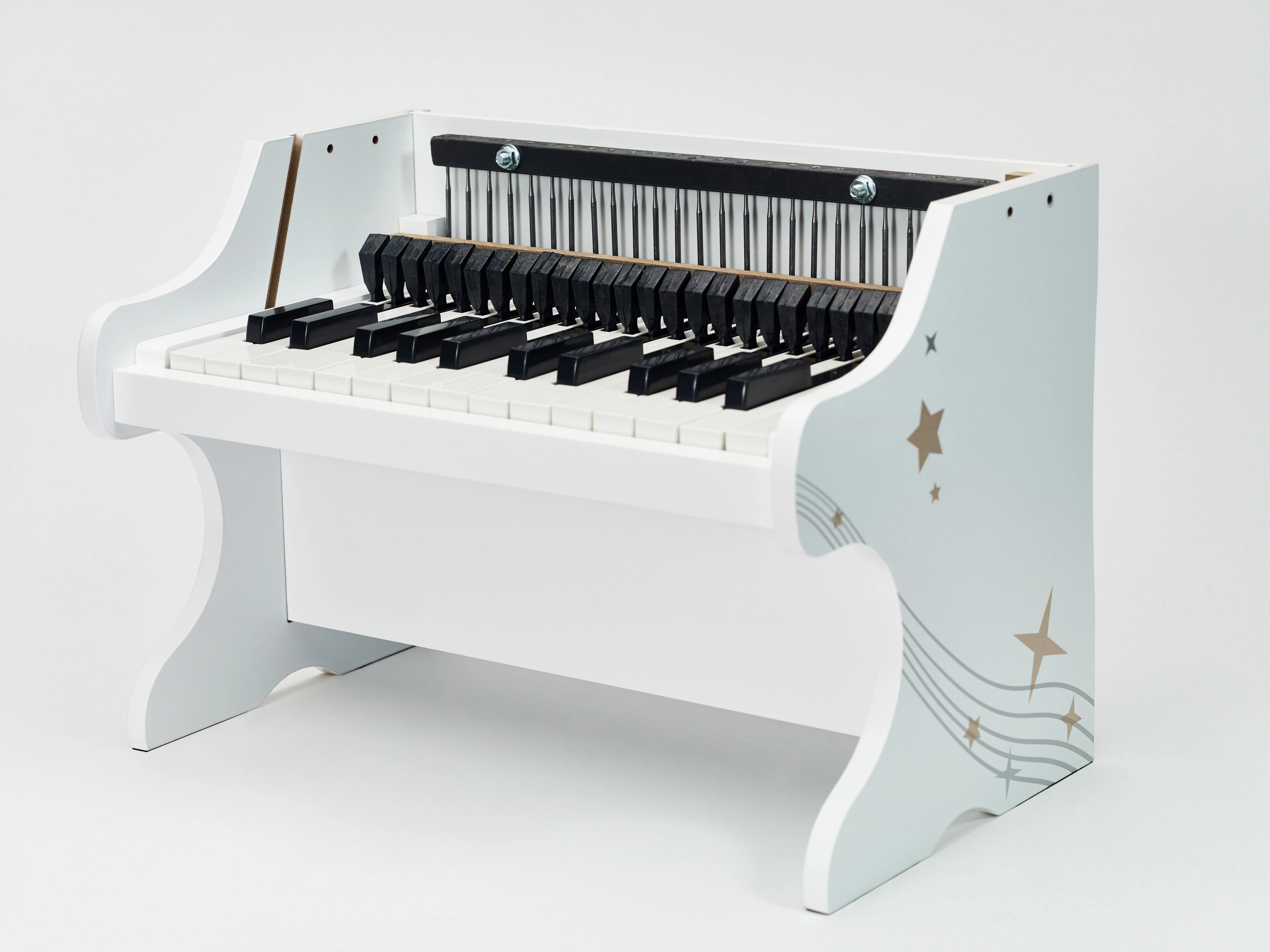 Η ανθεκτική ξύλινη δομή με μη τοξικό λευκό βερνίκι εξασφαλίζει αντοχή και ασφάλεια για την καθημερινή μουσική ενασχόληση των μικρών μουσικών.