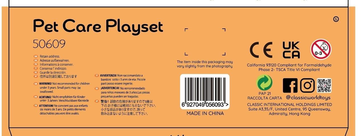 Το παιδικό σετ της CLASSIC WORLD προσφέρει ό,τι χρειάζεται για ρεαλιστικό παιχνίδι κτηνιάτρου και φροντίδας κατοικιδίων. Περιλαμβάνει 15 κομμάτια όπως μπολ, τροφή, βούρτσα, σεσουάρ, ψαλιδάκι, λουράκι και φορητή τσάντα. Υποστηρίζει δημιουργικό παιχνίδι ρόλων και αναπτύσσει ενσυναίσθηση, υπευθυνότητα και λεπτή κινητικότητα. Ιδανικό για παιδιά από 3 ετών.