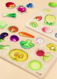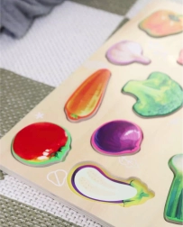 Κάθε κομμάτι αναπαριστά ένα διαφορετικό λαχανικό και εξασκεί την αναγνώριση σχημάτων, χρωμάτων και το λεξιλόγιο.