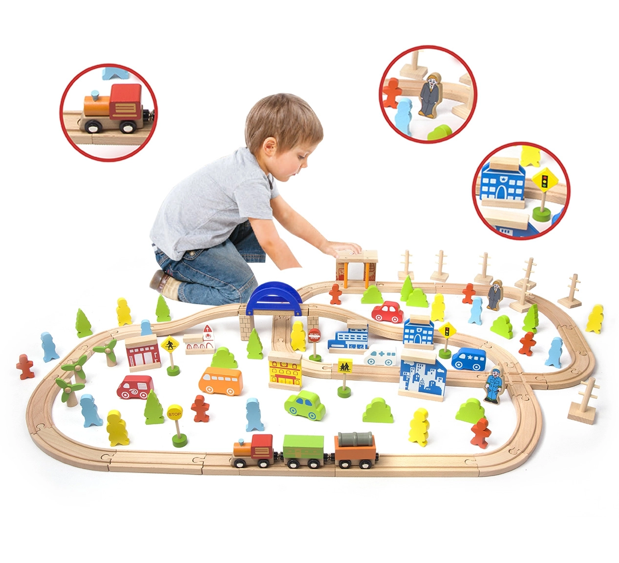 - Μηχανή, 2 βαγόνια, ράγες, γέφυρα/βιάντοκ, οχήματα, κτίρια, δέντρα, πινακίδες κυκλοφορίας, φιγούρες και άλλα αξεσουάρ
