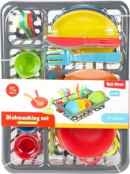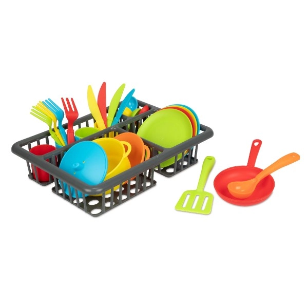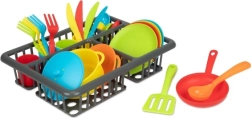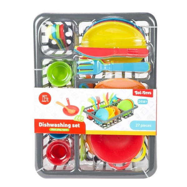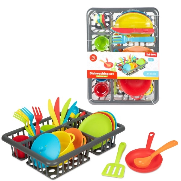 Παιχνιδιάρικο σετ κουζίνας για μικρούς σεφ με 27 κομμάτια – κατσαρόλα, τηγάνι, πιάτα, φλιτζάνια, μαχαιροπίρουνα και άλλα αξεσουάρ. Υποστηρίζει την δημιουργικότητα, τη λεπτή κινητικότητα και τις κοινωνικές δεξιότητες μέσα από παιχνίδι μαγειρέματος και σερβιρίσματος. Η πρακτική συσκευασία blister κρατάει όλα τα μέρη τακτοποιημένα. Κατάλληλο για παιδιά από 2 ετών.