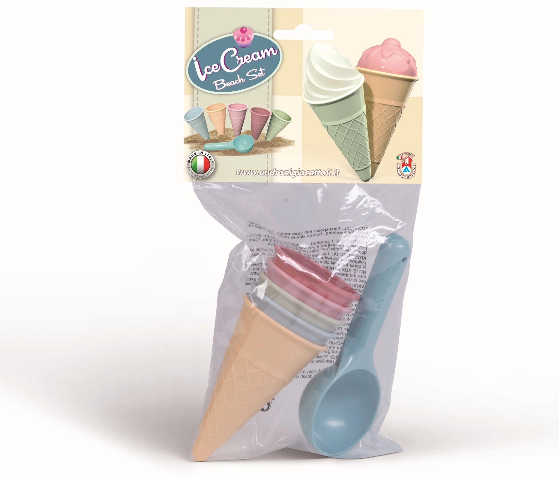 Παιχνιδιάρικο σετ 6 τεμαχίων για την άμμο για μικρούς παγωτατζήδες: περιλαμβάνει πέντε χωνάκια και κουτάλα για παγωτό. Κατασκευασμένο στην Ιταλία από ποιοτικό πλαστικό, κατάλληλο από 10 μηνών.