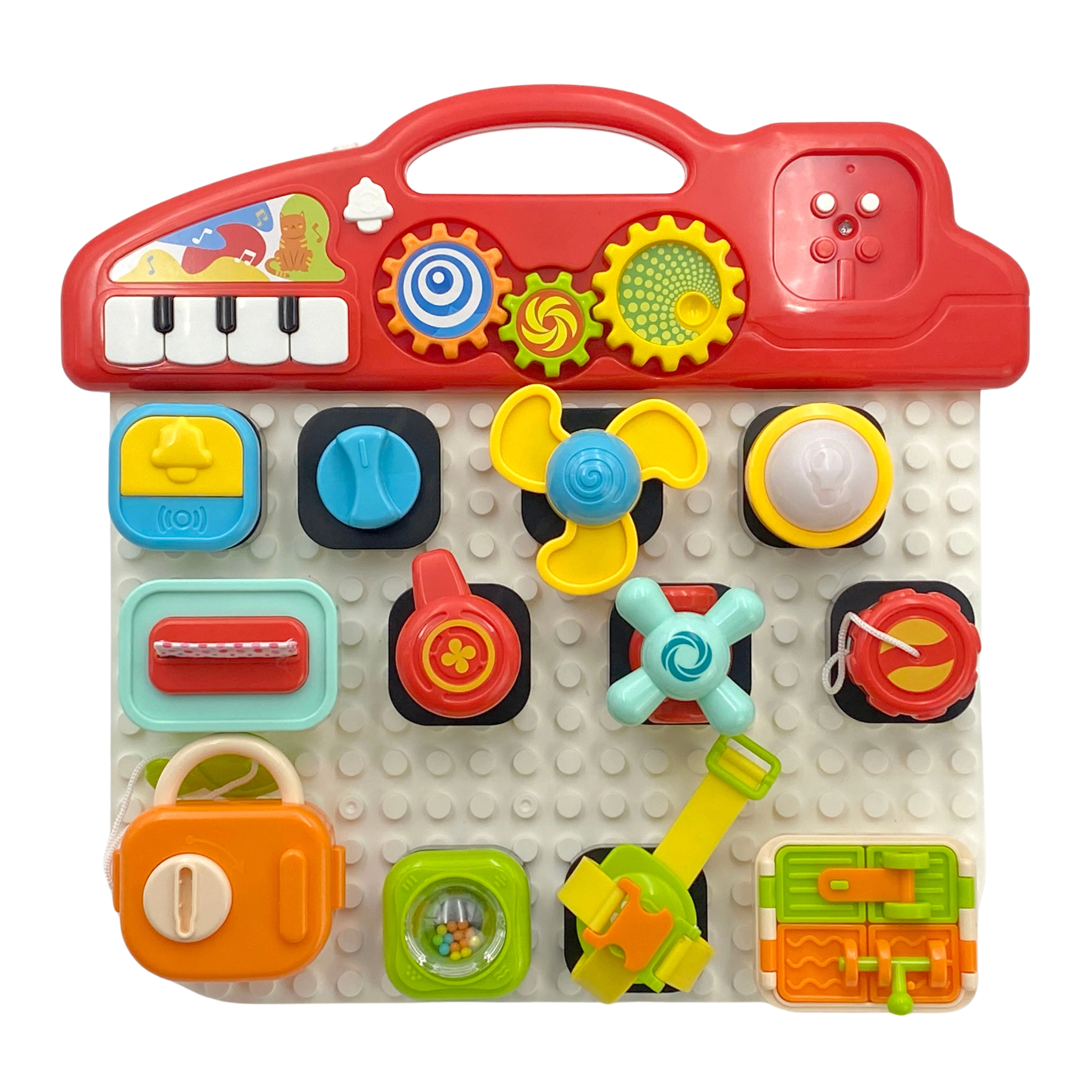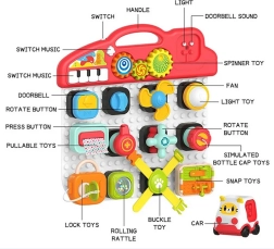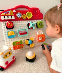 Ο πολύχρωμος πίνακας περιλαμβάνει διάφορους διακόπτες, κουμπιά και πλήκτρα που αναπτύσσουν τις κινητικές δεξιότητες.