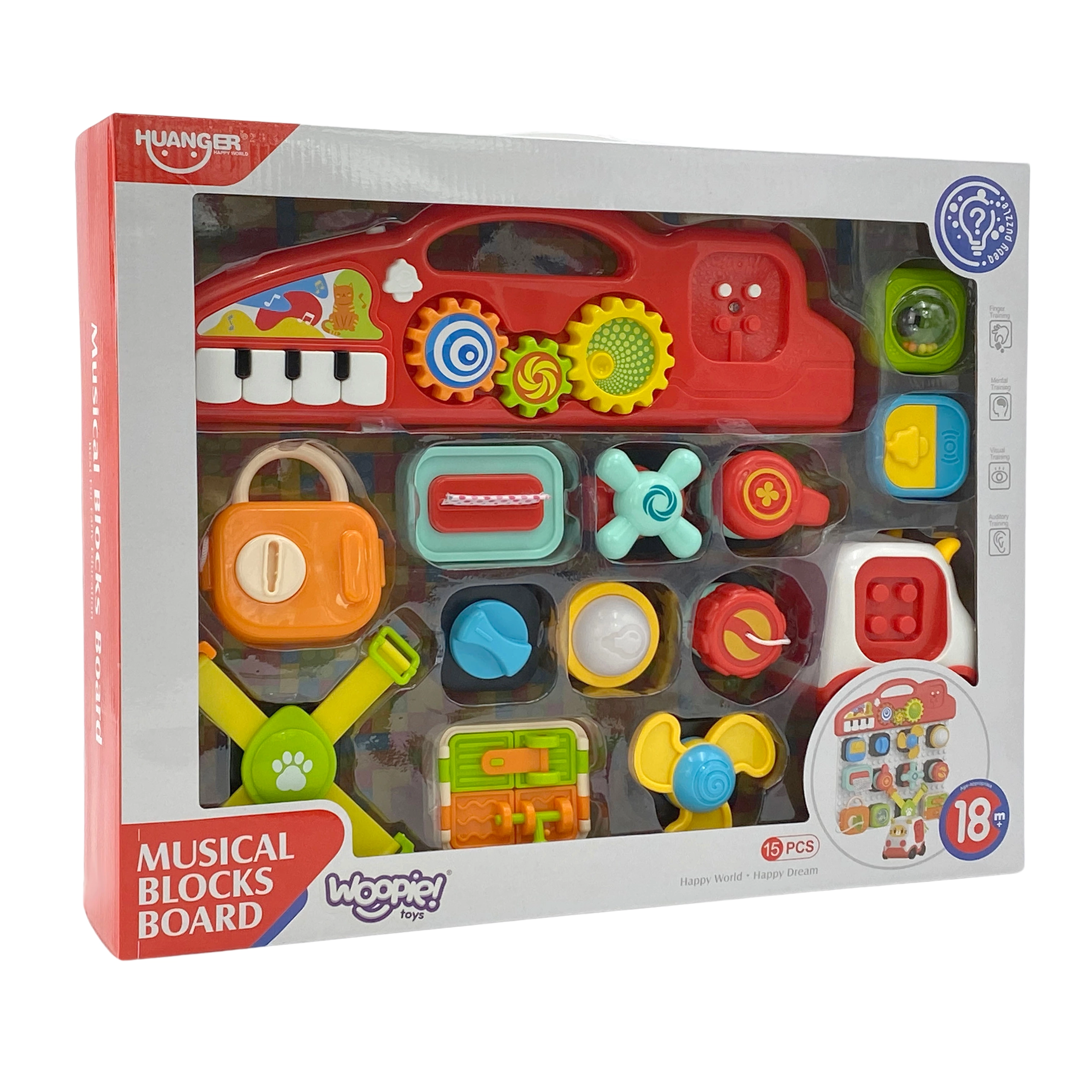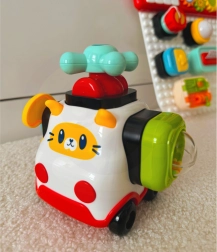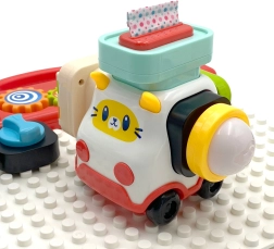 Ο πίνακας αποτελείται από ποικίλα διαδραστικά στοιχεία που μπορούν να προσαρμόζονται και να αποσπώνται ελεύθερα, παρόμοια με τουβλάκια. Στη συσκευασία περιλαμβάνεται επίσης αυτοκινητάκι σε σχήμα γάτας, στο οποίο μπορούν να προσαρμόζονται στοιχεία από την πινακίδα. Στα προσαρτώμενα τουβλάκια υπάρχουν διάφοροι τύποι διακοπτών, κουμπιών, πλήκτρων, αποσπώμενα μαντηλάκια, κλειδαριά με κλειδί και ανοιγόμενα παραθυράκια. Αυτά τα στοιχεία αναπτύσσουν στο παιδί κινητικές, γνωστικές και αισθητηριακές δεξιότητες και ασκούν επίσης τον συντονισμό χεριού-ματιού.