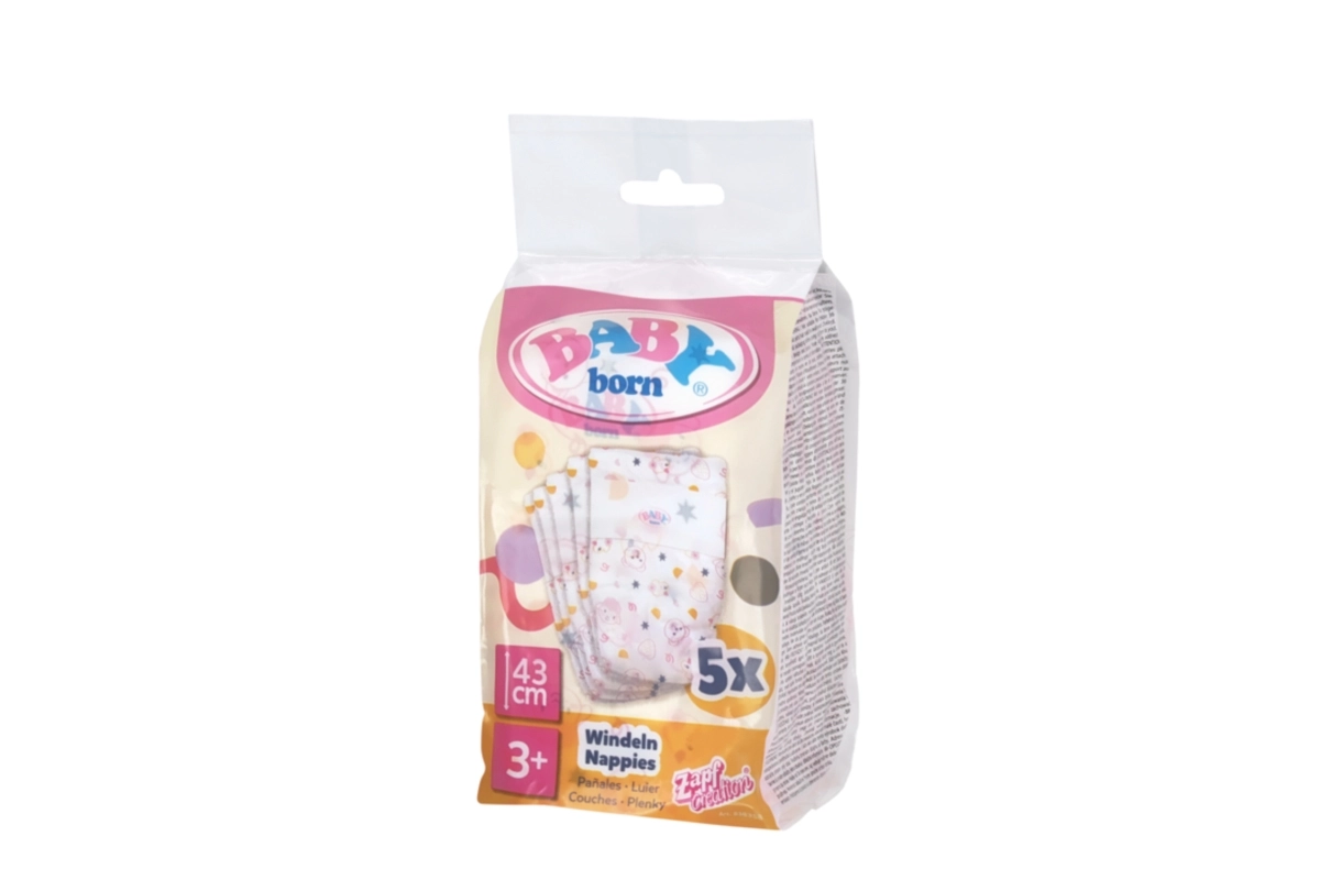 Οι πάνες είναι ειδικά προσαρμοσμένες για κούκλες BABY born 43 cm, φοριούνται εύκολα και μένουν στη θέση τους χάρη στα ελαστικά τελειώματα.