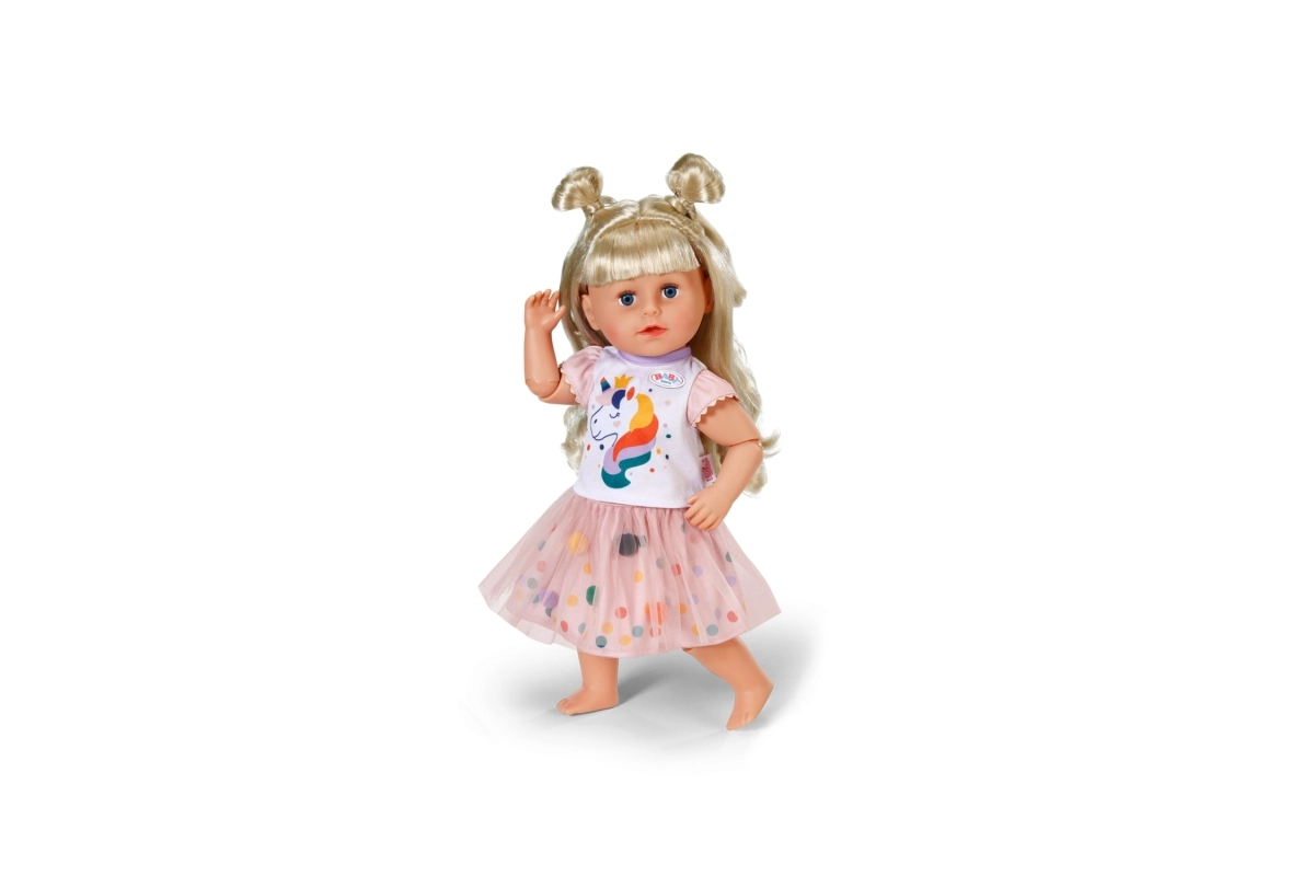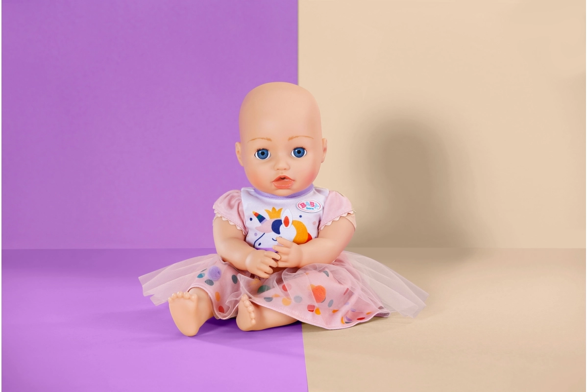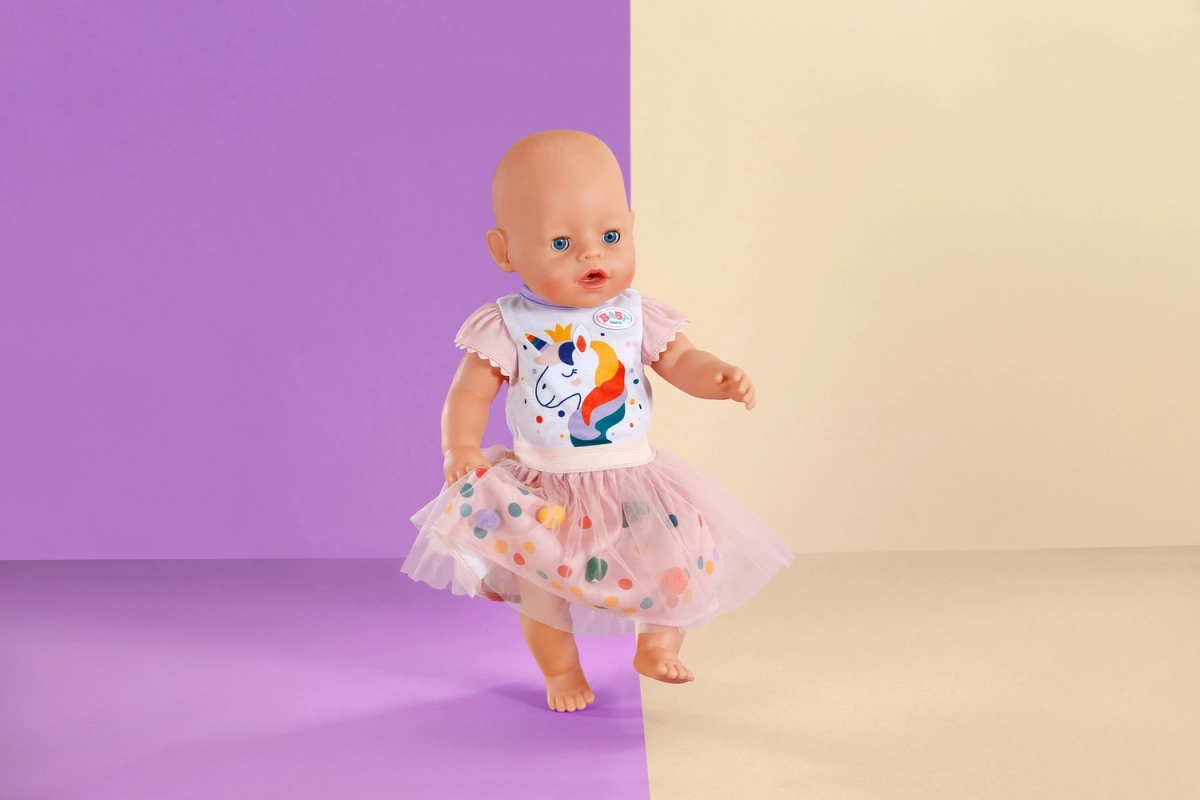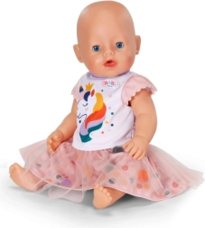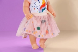 Χαριτωμένο διμερές σετ για κούκλες μεγέθους 43 cm που φέρνει στο παιχνίδι φαντασία και χρώμα. Το λευκό μπλουζάκι με στάμπα μονόκερου και η ροζ τούλινη φούστα με πολύχρωμα πομ-πομ δημιουργούν ένα γοητευτικό σύνολο για καθημερινό παιχνίδι και ξεχωριστές στιγμές. Χάρη στα μαλακά υλικά, τη ελαστική μέση και τον προσεγμένο σχεδιασμό, το ντύσιμο γίνεται εύκολα και είναι ιδανικό για δημιουργικό παιχνίδι μεγάλης διάρκειας.