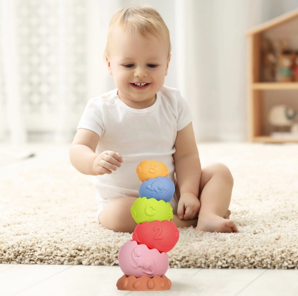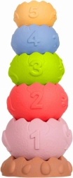 Τα παστέλ κομμάτια πιάνεται εύκολα και στοιβάζονται σταθερά σε έναν ψηλό πύργο. Τα παιδιά εξασκούν τον συντονισμό ματιού–χεριού και την υπομονή σε κάθε χτίσιμο της πυραμίδας.