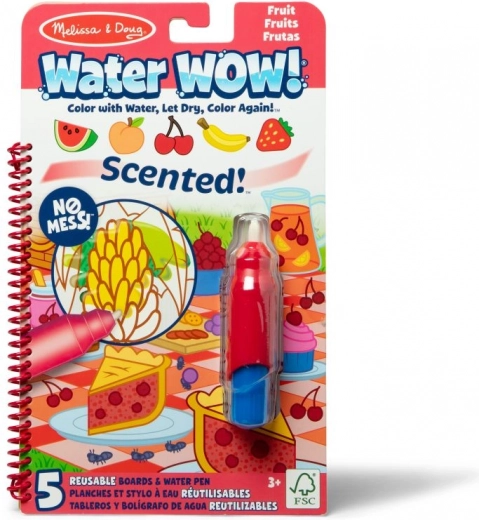 Οι αρωματικές υδατοζωγραφιές Water WOW! προσφέρουν στα παιδιά δημιουργική διασκέδαση χωρίς μπογιές και λεκέδες. Με το βρέξιμο, οι εικόνες με θέμα τα φρούτα χρωματίζονται αμέσως και, αφού στεγνώσουν, ξεθωριάζουν ώστε να χρησιμοποιούνται ξανά και ξανά. Το συμπαγές σπιράλ μπλοκ με το παρεχόμενο υδατοστυλό είναι ιδανικός σύντροφος για τα ταξίδια.