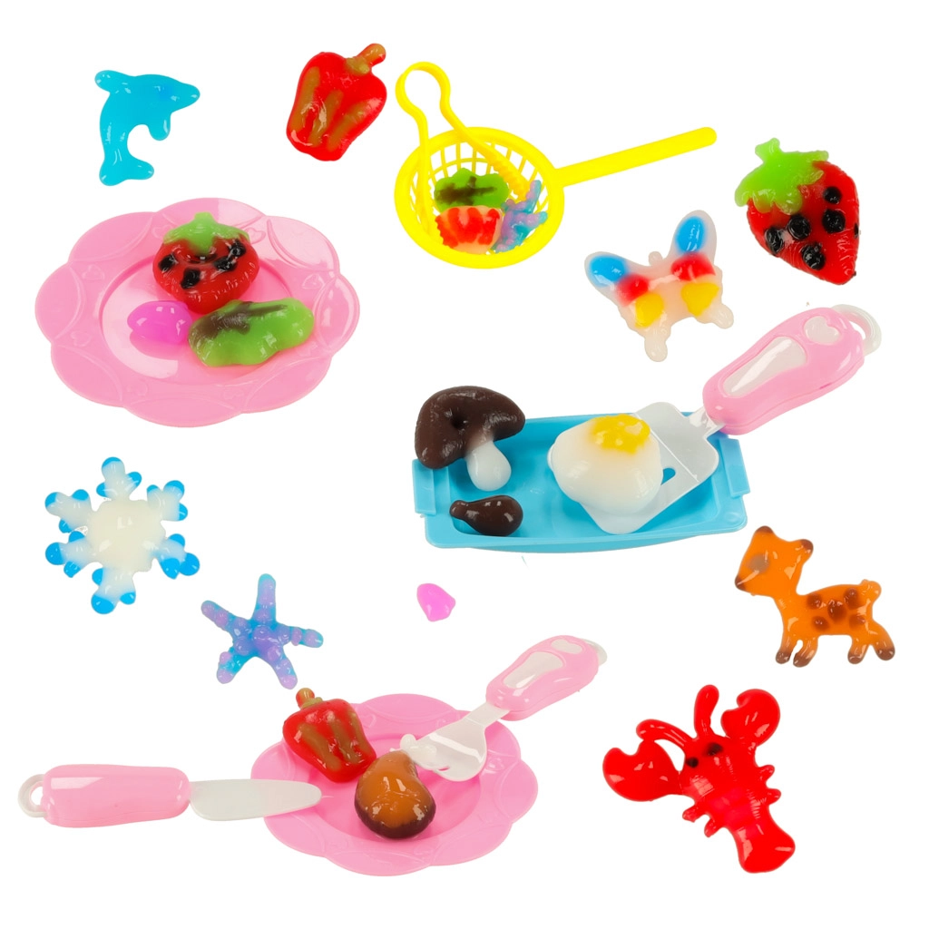 Περιεχόμενα συσκευασίας: Το σετ περιλαμβάνει 12 φιαλίδια τζελ σε διάφορα χρώματα, 24 καλούπια, κυπελλάκι με γαλακτικά ασβεστίου, 4 πιατάκια, 4 δίσκους, 2 σουρωτήρια, 2 μικρές λαβίδες, 1 κούπα με καπάκι για διαδραστικό παιχνίδι και άλλα.