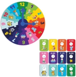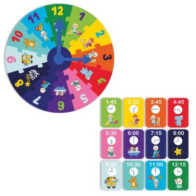 Πολύχρωμο εκπαιδευτικό παζλ σε σχήμα ρολογιού για παιδιά από 3 ετών, εμπνευσμένο από τη σειρά COCOMELON. Βοηθά στην ανάπτυξη της λεπτής κινητικότητας, της αναγνώρισης σχημάτων και χρωμάτων και εισάγει τα παιδιά στις βασικές αρχές μέτρησης του χρόνου με διασκεδαστικό τρόπο.