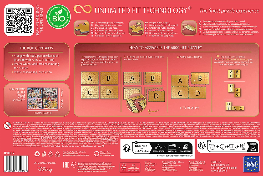 Συνθέστε τον μαγικό κόσμο της DISNEY με το μοναδικό παζλ TREFL UFT συνολικά 6000 κομματιών. Η συσκευασία περιλαμβάνει τέσσερις ανεξάρτητες εικόνες από 1500 κομμάτια η καθεμία, τις οποίες μπορείτε, χάρη στην τεχνολογία Unlimited Fit Technology (UFT), να συνδέσετε όπως θέλετε σε μία μεγάλη σύνθεση. Απολαύστε την υψηλότερη ποιότητα εκτύπωσης, τα ανθεκτικά μπλε χάρτινα κομμάτια, την εύκολη μεταφορά συναρμολογημένων τμημάτων και την οικολογική συσκευασία χωρίς πλαστική μεμβράνη.
