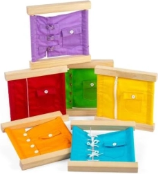 Το σετ έξι μοντεσόρι πλαισίων από την Bigjigs Toys βοηθά παιδιά από 3 ετών να εξασκούν την αυτοεξυπηρέτηση και τη λεπτή κινητικότητα. Κάθε ξύλινο πλαίσιο προσφέρει διαφορετικό κλείσιμο – φερμουάρ, κουμπιά, κορδόνια, αγκράφες, τρουκς και κλιπ Velcro. Κατασκευασμένο από ξύλο με πιστοποίηση FSC, ασφαλή μη τοξικά χρώματα, πληροί τα ευρωπαϊκά πρότυπα.