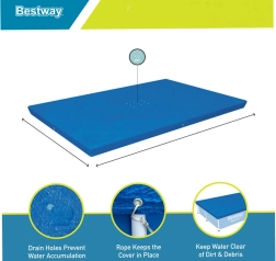 Το κάλυμμα Bestway έχει σχεδιαστεί για να προστατεύει αποτελεσματικά την πισίνα σας από έντομα, φύλλα, πουλιά και ελαφριά βροχή. Χάρη στα στιβαρά σχοινιά στερέωσης είναι ανθεκτικό στον άνεμο και οι οπές αποστράγγισης αποτρέπουν τη συσσώρευση νερού. Το κάλυμμα προσφέρει επιπλέον θερμική μόνωση του νερού στην πισίνα.