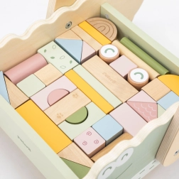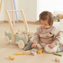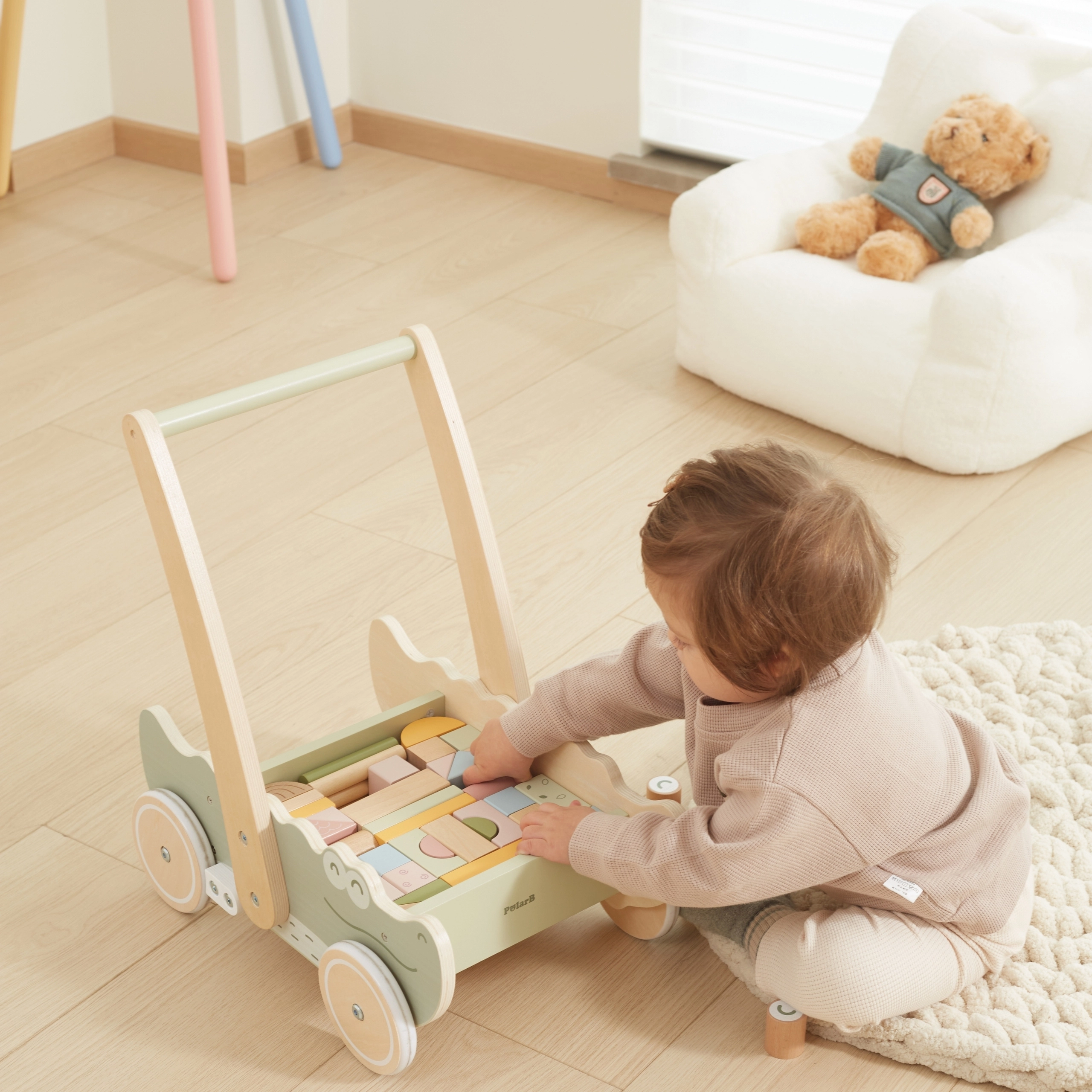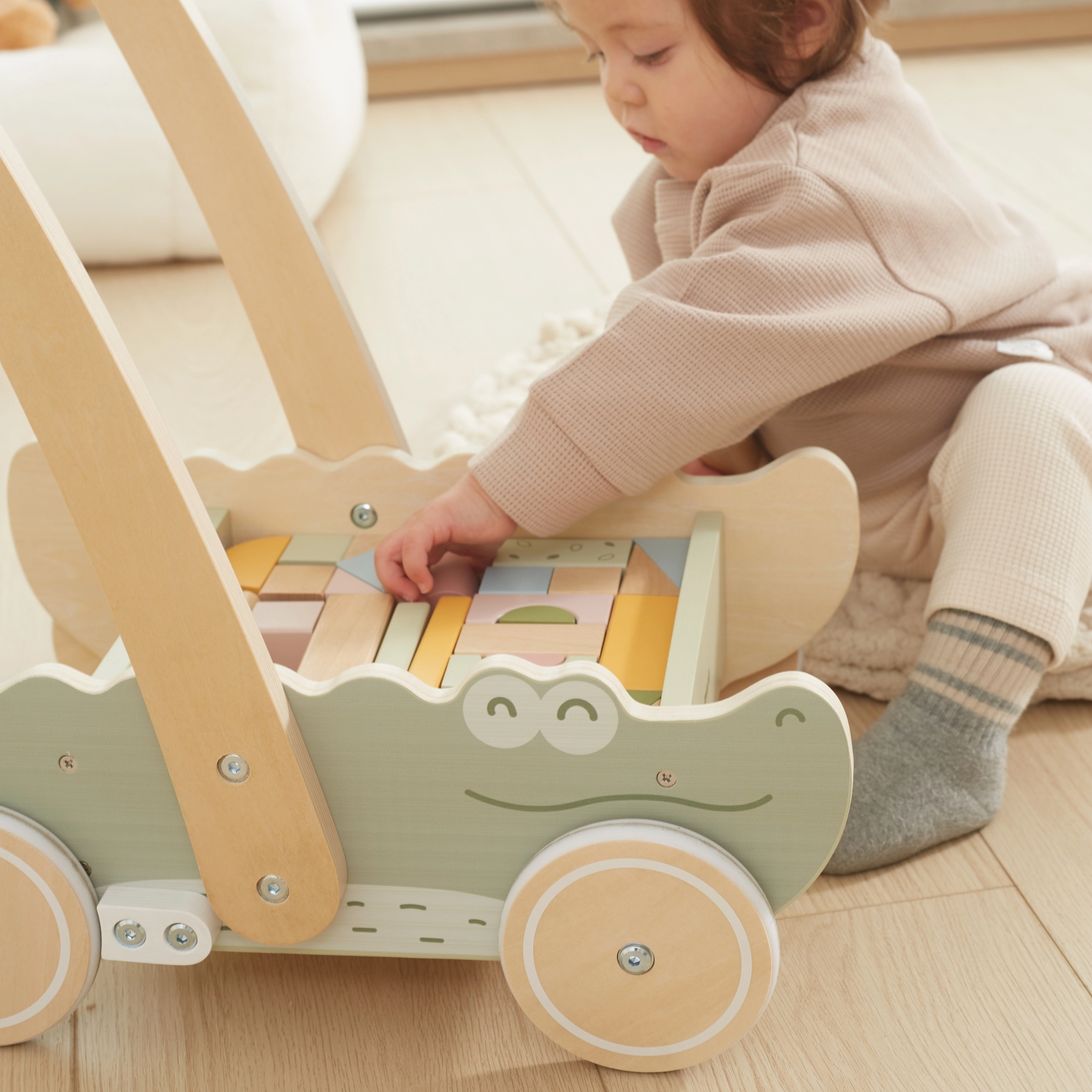 Οι πολύχρωμοι κύβοι σε διάφορα σχήματα και παστέλ αποχρώσεις όχι μόνο ενθαρρύνουν το δημιουργικό παιχνίδι, αλλά αναπτύσσουν και τη λεπτή κινητικότητα. Οι μαλακοί λαστιχένιοι τροχοί προστατεύουν τα πατώματα και εξασφαλίζουν ομαλή κίνηση. Αυτός ο κροκόδειλος με χαριτωμένο σχεδιασμό και απαλές αποχρώσεις θα γίνει το αγαπημένο παιχνίδι κάθε παιδιού!