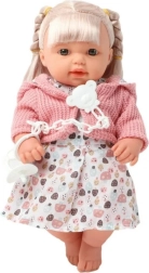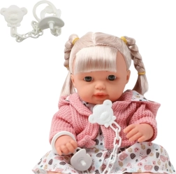 Ένα ακόμη πλεονέκτημα είναι τα ρεαλιστικά ηχητικά εφέ – η κούκλα βγάζει ήχους όπως γέλιο ή κλάμα, ζωντανεύοντας και εμπλουτίζοντας το παιχνίδι. Η κούκλα φοράει πολύχρωμο φορεματάκι και ένα μαλακό ροζ ζακετάκι που αφαιρείται, προσφέροντας περισσότερες δυνατότητες δημιουργικής διασκέδασης. Το σετ περιλαμβάνει επίσης πιπίλα σε αλυσίδα με κρεμαστό, ώστε το παιδί να νιώθει σαν πραγματικός φροντιστής. Είναι κατασκευασμένη από ανθεκτικό και ασφαλές πλαστικό, ελαφριά, ευχάριστη στην αφή και ιδανική για καθημερινές αγκαλιές, φροντίδα και κοινό παιχνίδι.