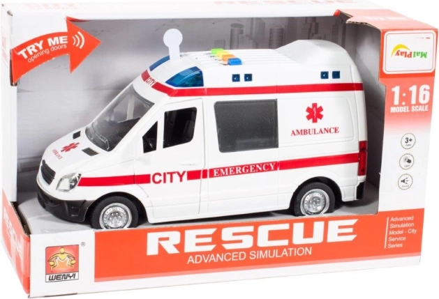 Ρεαλιστικό παιδικό ασθενοφόρο σε κλίμακα 1:16 που προσφέρει στα παιδιά αυθεντική εμπειρία αποστολής διάσωσης. Με το πάτημα των κουμπιών στην οροφή, ανάβουν οι φάροι και ακούγονται ήχοι κινητήρα, σειρήνας και κόρνας, κάνοντας το παιχνίδι ακόμη πιο συναρπαστικό.