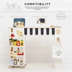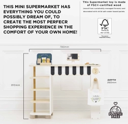 - Πάγκος με ράφι, ταμειακή μηχανή, ταινιόδρομος, σκάνερ, παιχνίδια χρήματα, κάρτες πληρωμής/επιβράβευσης/πιστότητας, ένδειξη «επόμενος πελάτης», πινακίδα γραφής και πινακίδα με ειδική προσφορά, βαμβακερή τσάντα, ποικιλία ξύλινων τροφίμων