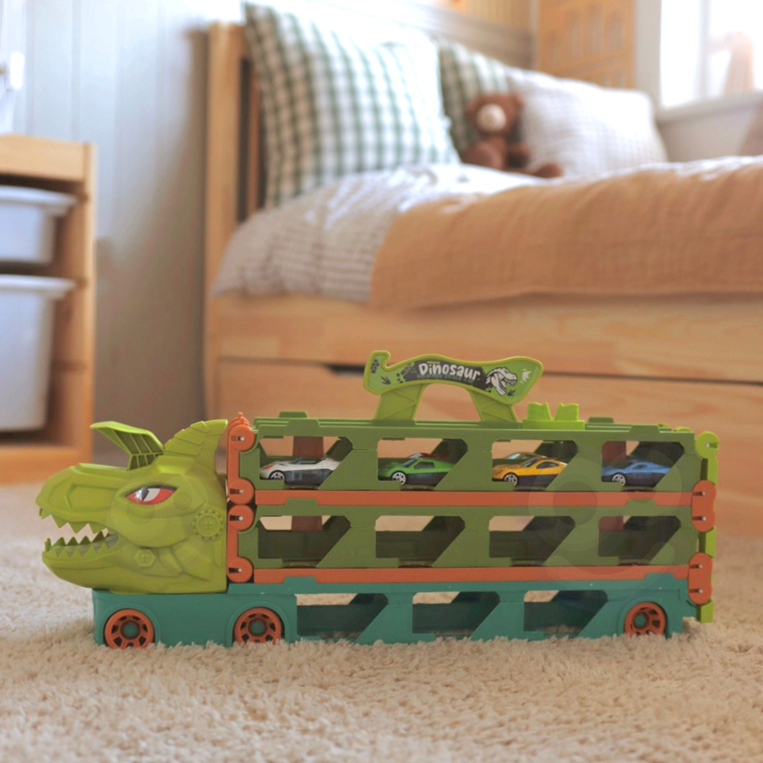 Το διασκεδαστικό φορτηγό Ντίνο είναι εξαιρετική επιλογή για παιδιά από 3 ετών. Περιλαμβάνει φορτηγό που μετατρέπεται σε αγωνιστική πίστα με θέμα δεινόσαυρο, προσφέροντας ατελείωτη διασκέδαση. Το σύστημα εκτόξευσης επιτρέπει την καταπέλτιση των αυτοκινήτων προς τα εμπρός με το πάτημα του κουμπιού στο κεφάλι του δεινόσαυρου.