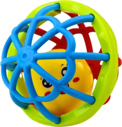Στο εσωτερικό υπάρχει ένα κίτρινο πλαστικό μπαλάκι που, όταν κουνιέται, παράγει απαλό ήχο κουδουνίστρας και ενθαρρύνει την αλληλεπίδραση και την περιέργεια. Η εργονομική μορφή ταιριάζει άριστα στα μικρά παιδικά χέρια και το χαμηλό βάρος διευκολύνει τον χειρισμό.