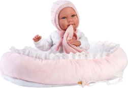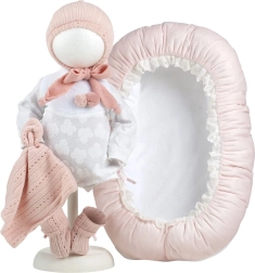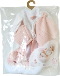Το ρούχο για κούκλα μωρό μεγέθους 40–42 εκ. είναι μέρος ενός σετ 4 τεμαχίων, που περιλαμβάνει τρία κομμάτια ρουχισμού, ένα διακοσμητικό πανάκι παρηγοριάς και μια φωλίτσα. Χειροποίητο στην Ισπανία και κατάλληλο για παιδιά από 3 ετών.