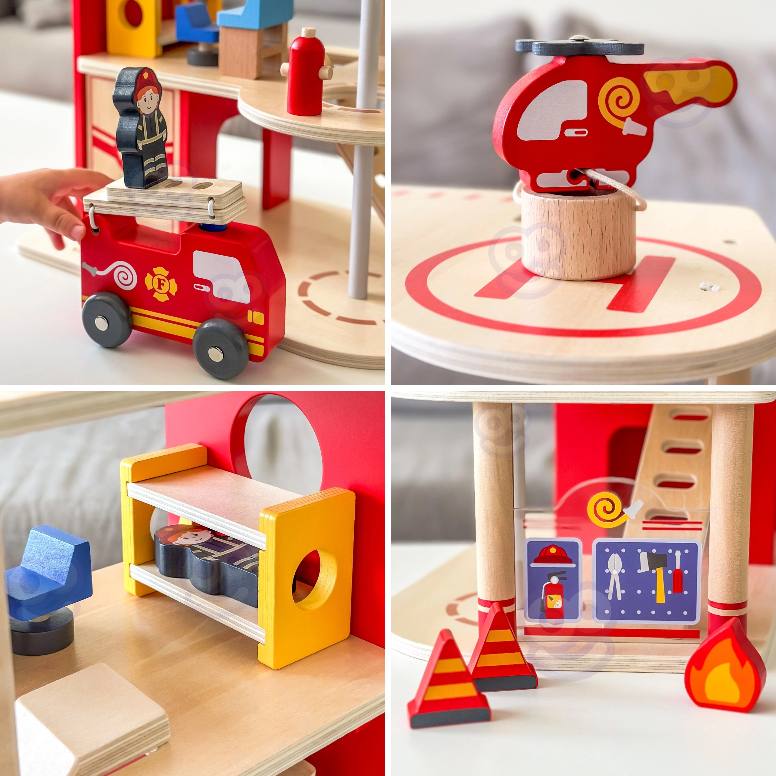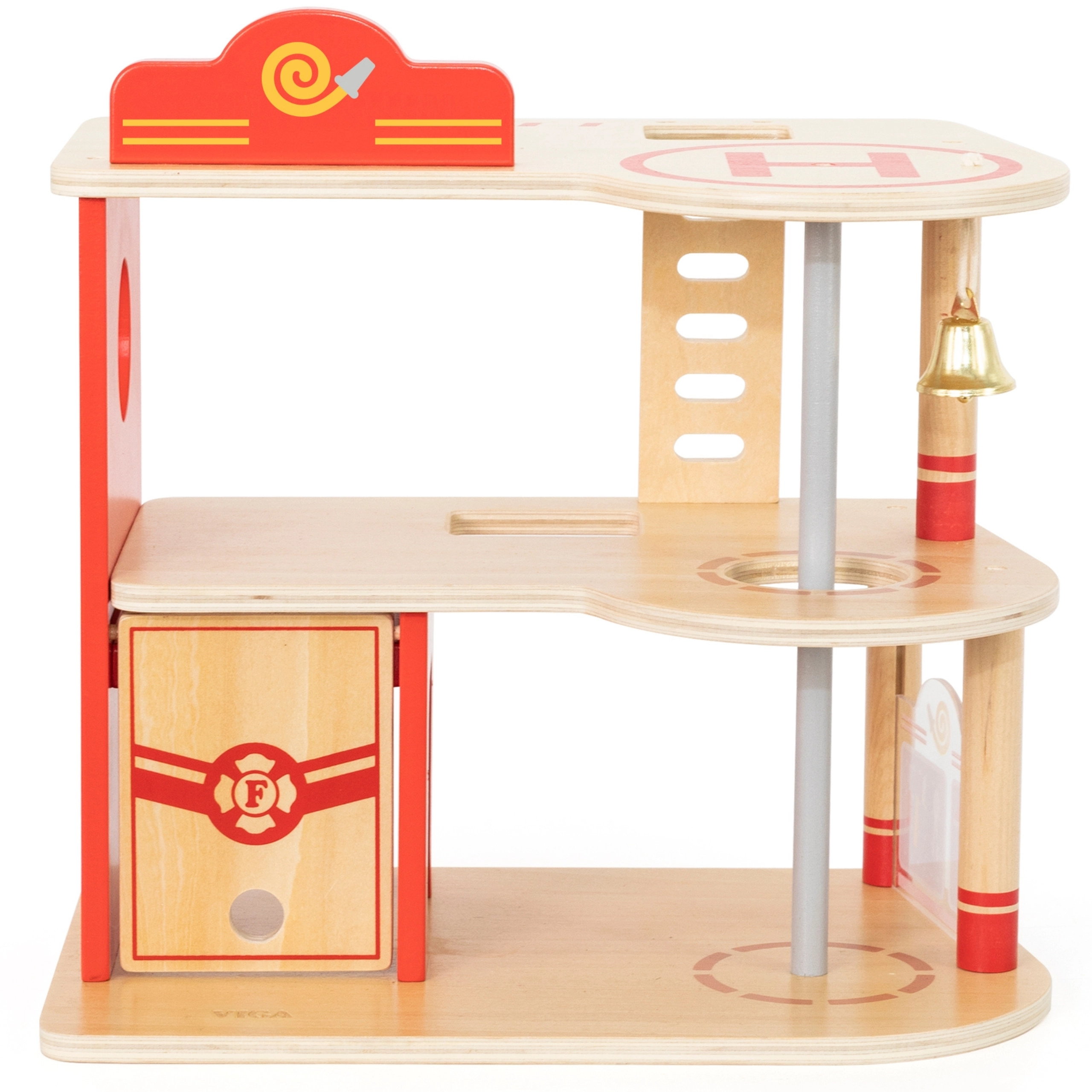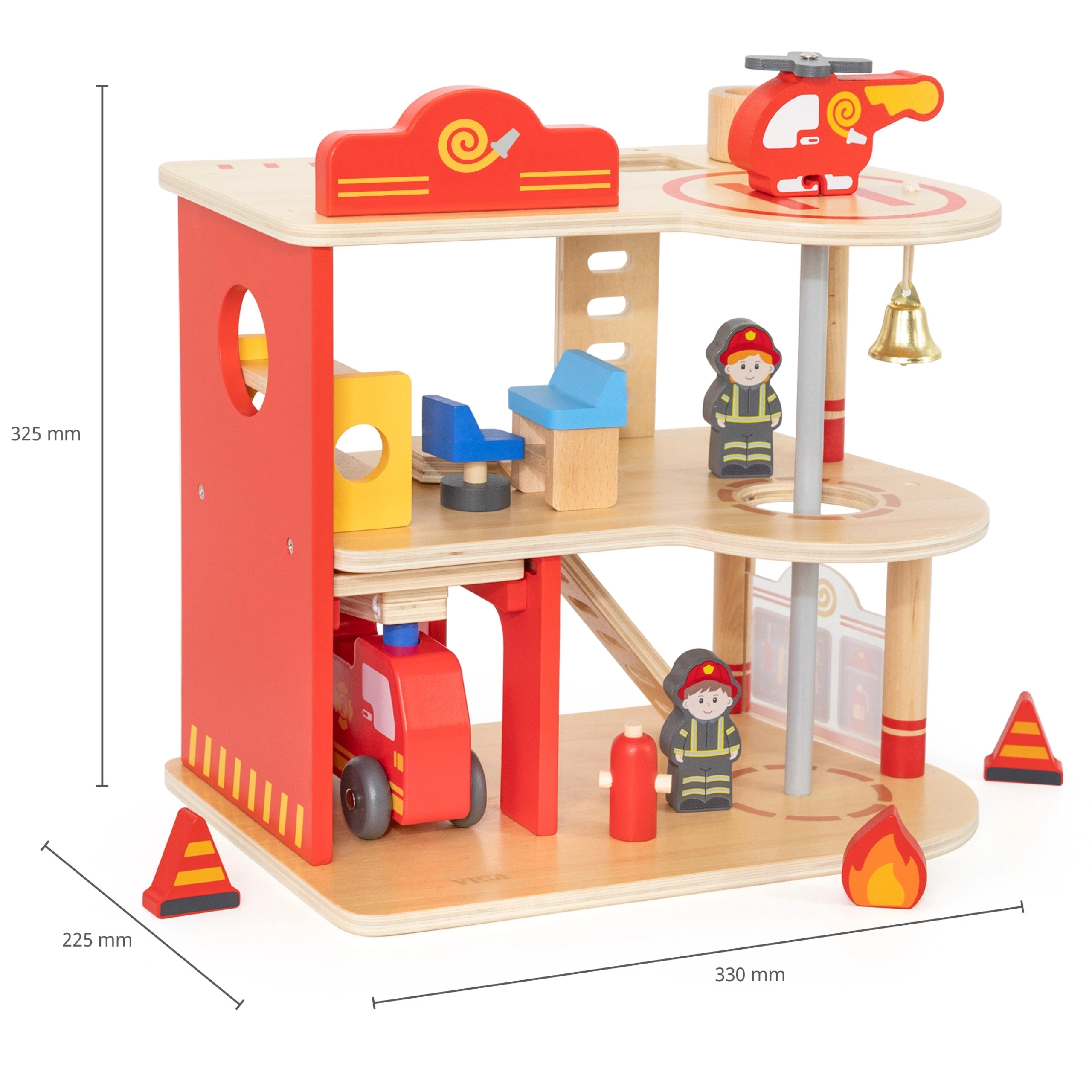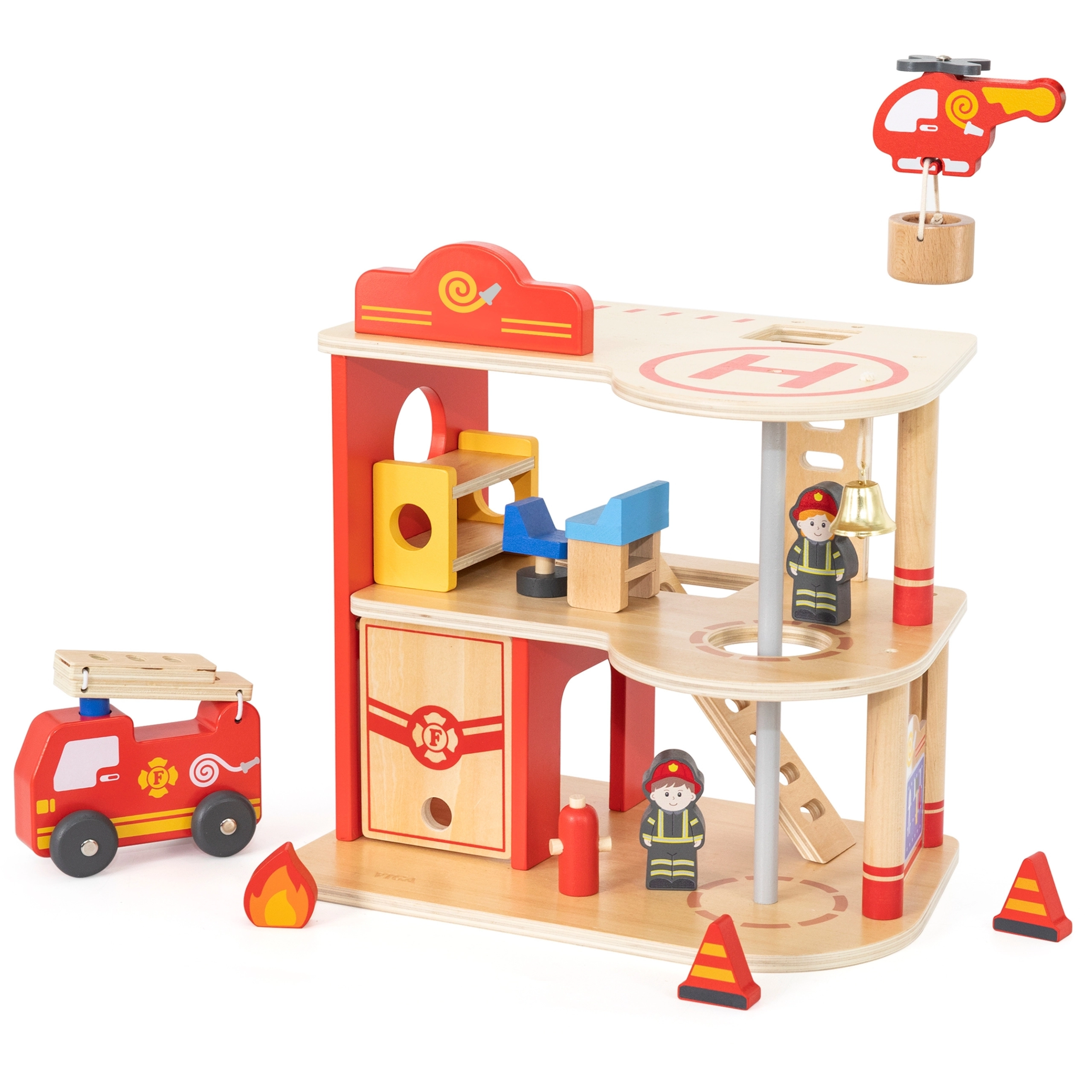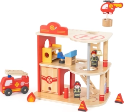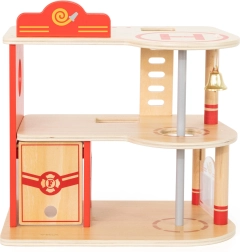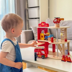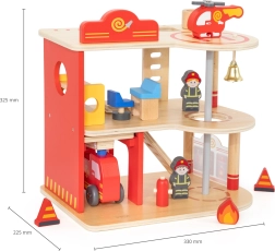 Αυτός ο ανθεκτικός ξύλινος πυροσβεστικός σταθμός τριών επιπέδων προσφέρει σε παιδιά από 3 ετών ατελείωτες ώρες δράσης. Στο ισόγειο υπάρχει γκαράζ για το πυροσβεστικό όχημα και χώρος για εξοπλισμό, στον δεύτερο όροφο μια ζεστή ζώνη ξεκούρασης με κουδούνι και κολόνα γρήγορης καθόδου, ενώ τον τρίτο όροφο κοσμεί ελικοδρόμιο για το πυροσβεστικό ελικόπτερο.