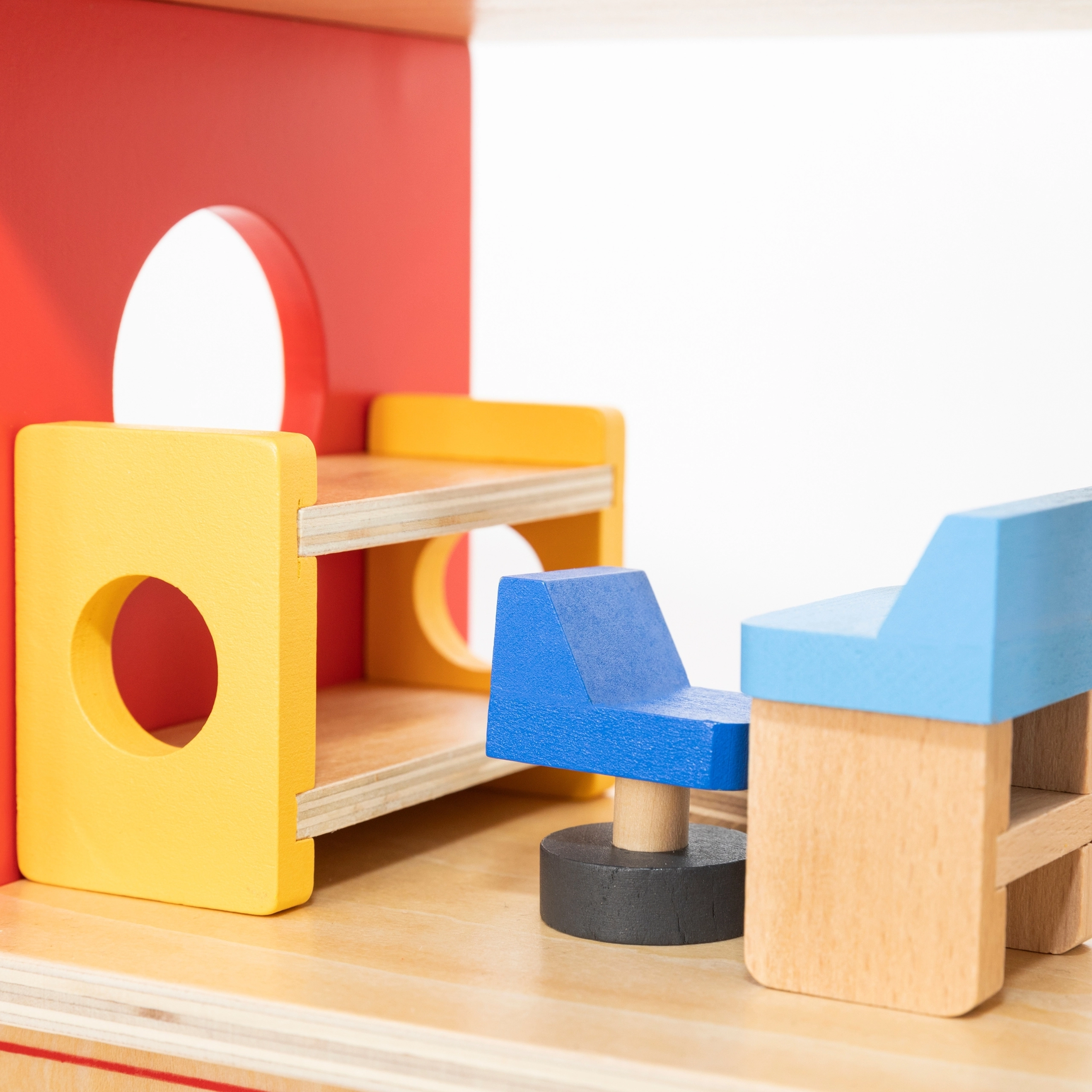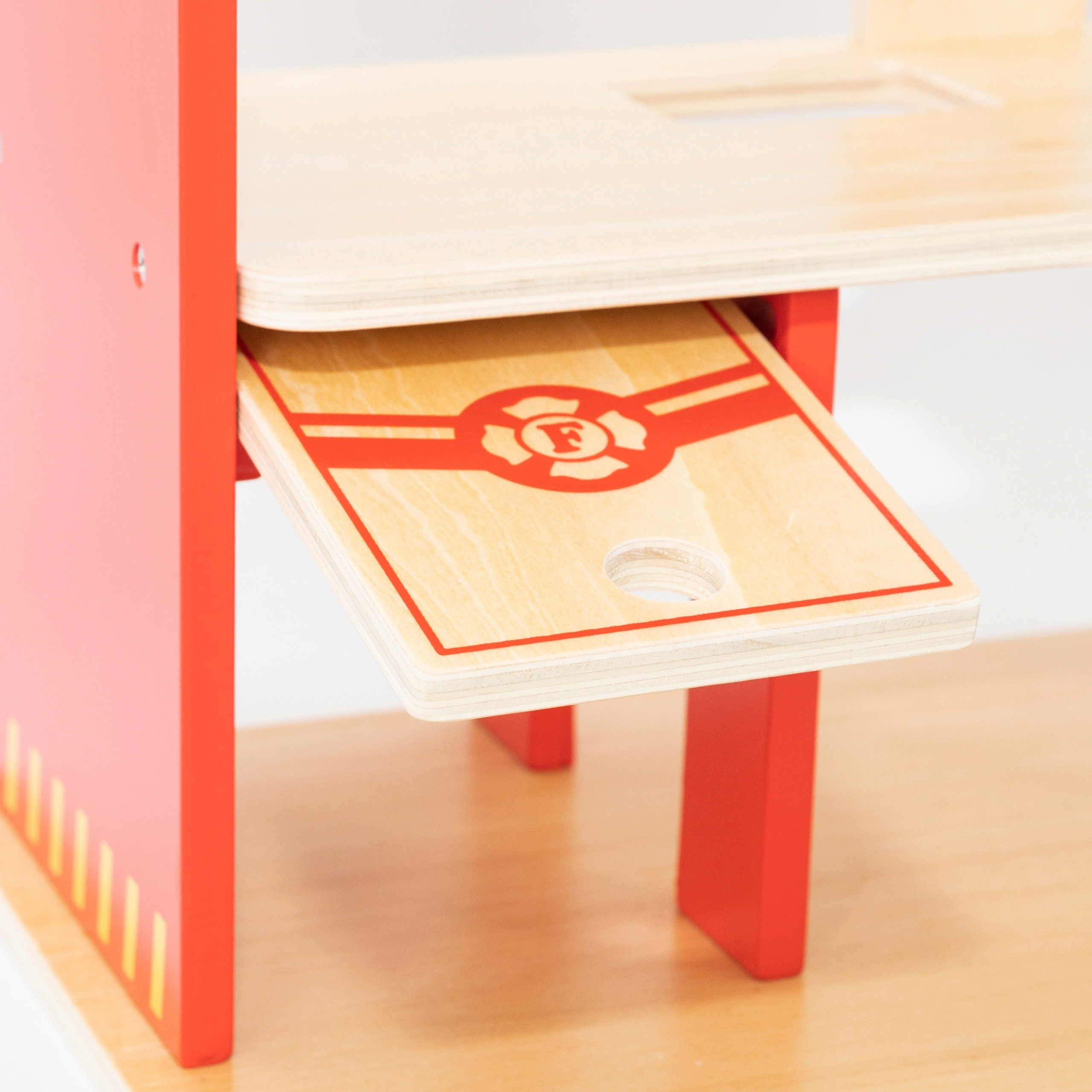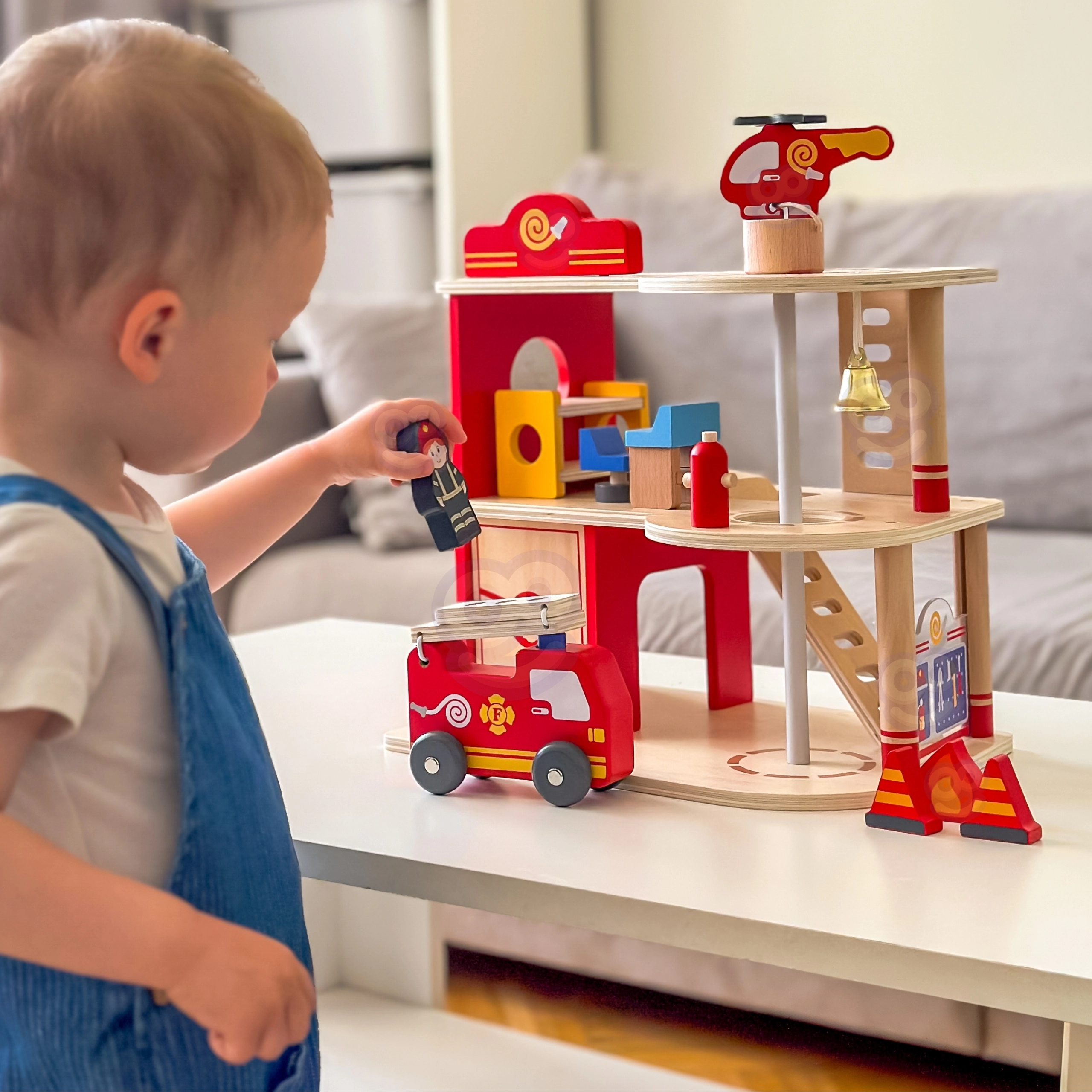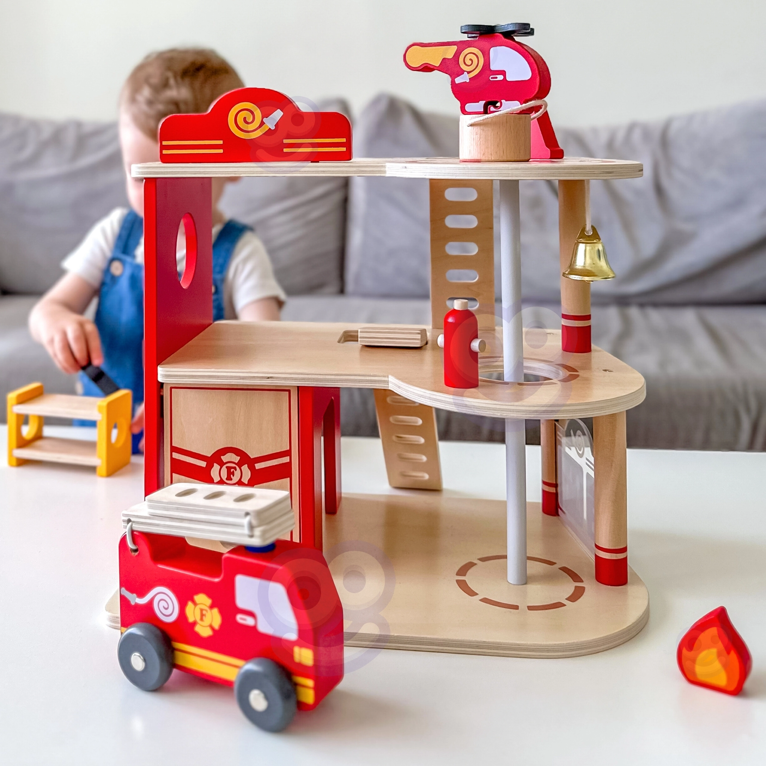 Αυτός ο ανθεκτικός ξύλινος πυροσβεστικός σταθμός τριών επιπέδων προσφέρει σε παιδιά από 3 ετών ατελείωτες ώρες δράσης. Στο ισόγειο υπάρχει γκαράζ για το πυροσβεστικό όχημα και χώρος για εξοπλισμό, στον δεύτερο όροφο μια ζεστή ζώνη ξεκούρασης με κουδούνι και κολόνα γρήγορης καθόδου, ενώ τον τρίτο όροφο κοσμεί ελικοδρόμιο για το πυροσβεστικό ελικόπτερο.