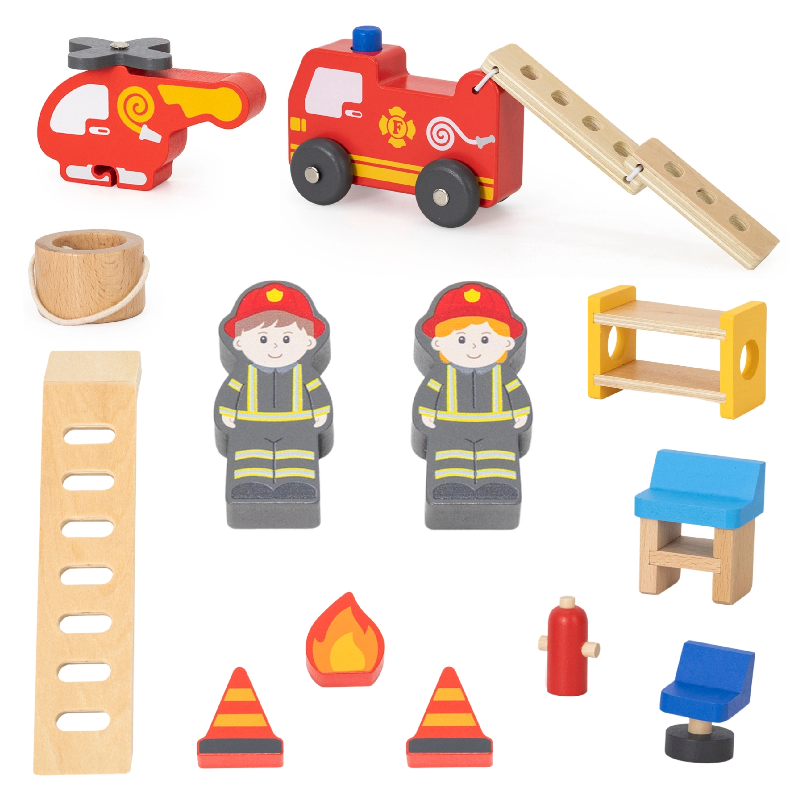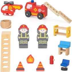 Στη συσκευασία θα βρείτε ό,τι χρειάζεται για συναρπαστικό παιχνίδι: πυροσβεστικό όχημα, ελικόπτερο με δοχείο νερού, 2 φιγούρες πυροσβεστών, φλόγα για «κατάσβεση», κώνοι, πυροσβεστήρας και έπιπλα (κρεβάτι, τραπέζι, καρέκλα). Ποιοτικό ξύλο, λείες ακμές και έντονα χρώματα εξασφαλίζουν ασφαλές και ανθεκτικό παιχνίδι.