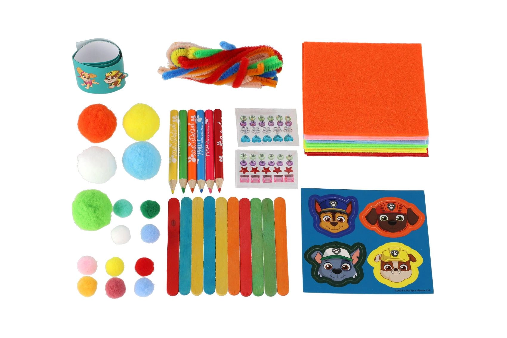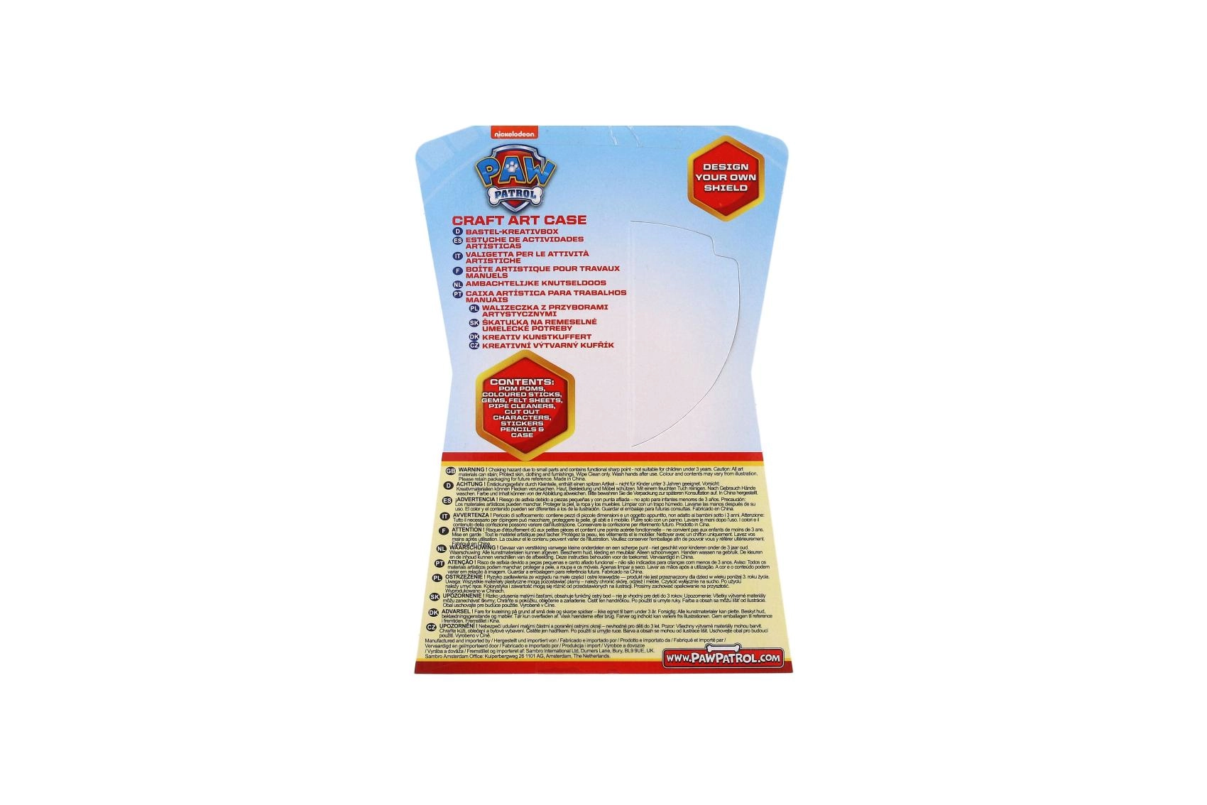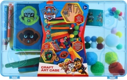 Στο εσωτερικό θα βρείτε μια πλούσια ποικιλία υλικών για κολλάζ, κόλληση και σχέδιο: απαλές φουντίτσες, χνουδωτά σύρματα (chenille), σχήματα από αφρώδες ή τσόχα, ξυλάκια, ξυλομπογιές και αυτοκόλλητα με αγαπημένους σκυλο-ήρωες. Περιλαμβάνονται επίσης κάρτες και δραστηριότητες τύπου «σχεδίασε τη δική σου ασπίδα», που αναπτύσσουν τη δημιουργικότητα και τις δεξιότητες.