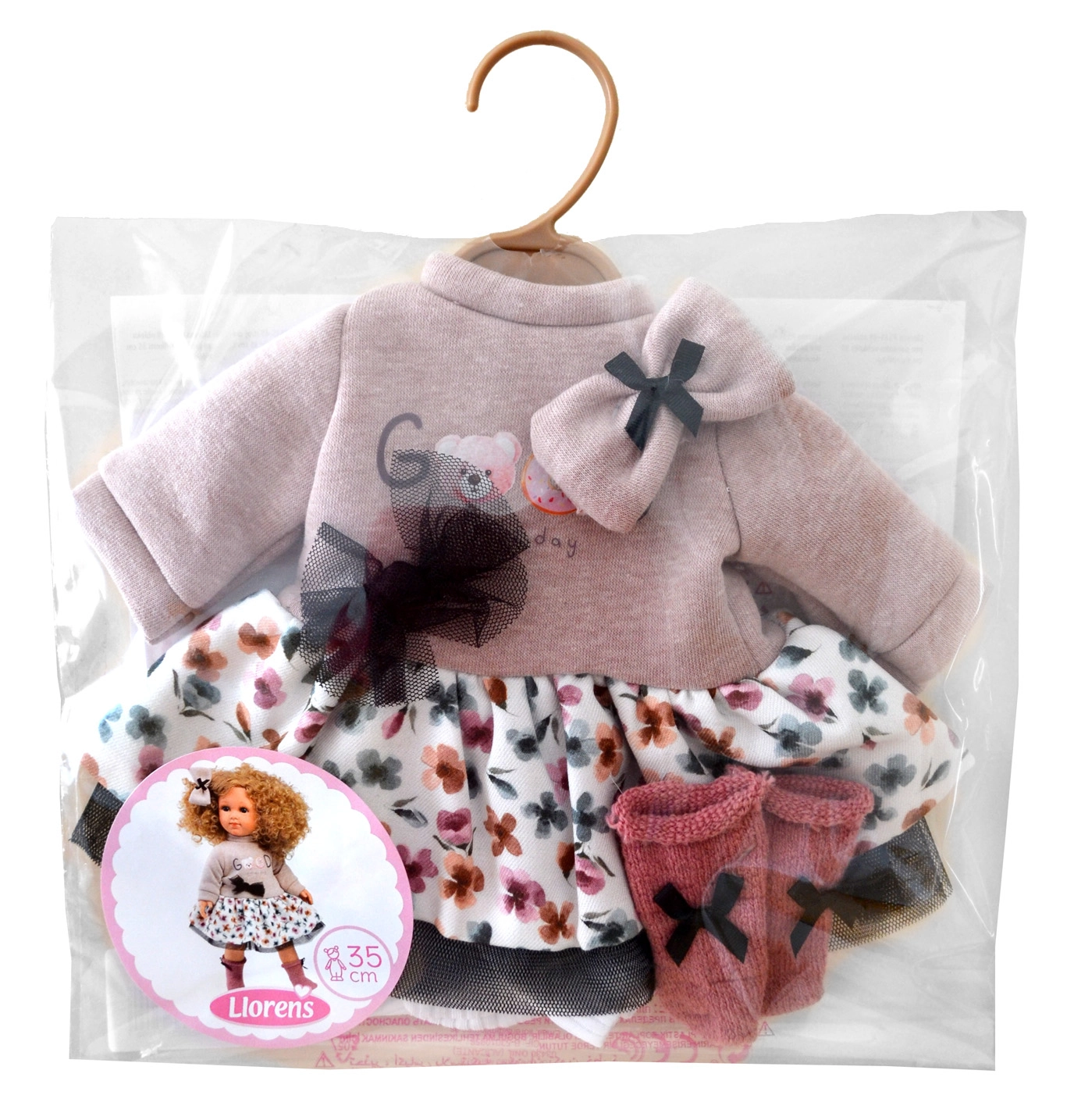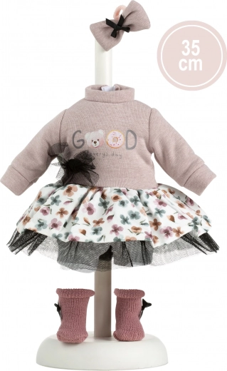 Το σετ περιλαμβάνει τοπ με μακριά μανίκια, φιόγκο και τούλινη λεπτομέρεια, λουλουδάτη φούστα με τούλινο τελείωμα, απαλές κάλτσες με μικρούς φιόγκους και διακοσμητικό λαστιχάκι για τα μαλλιά. Χάρη στο καθολικό μέγεθος, φοριέται εύκολα σε κούκλες ύψους 35 εκ. και ενθαρρύνει δημιουργικό παιχνίδι.