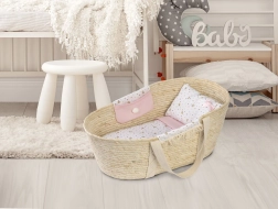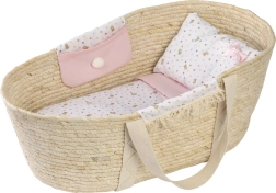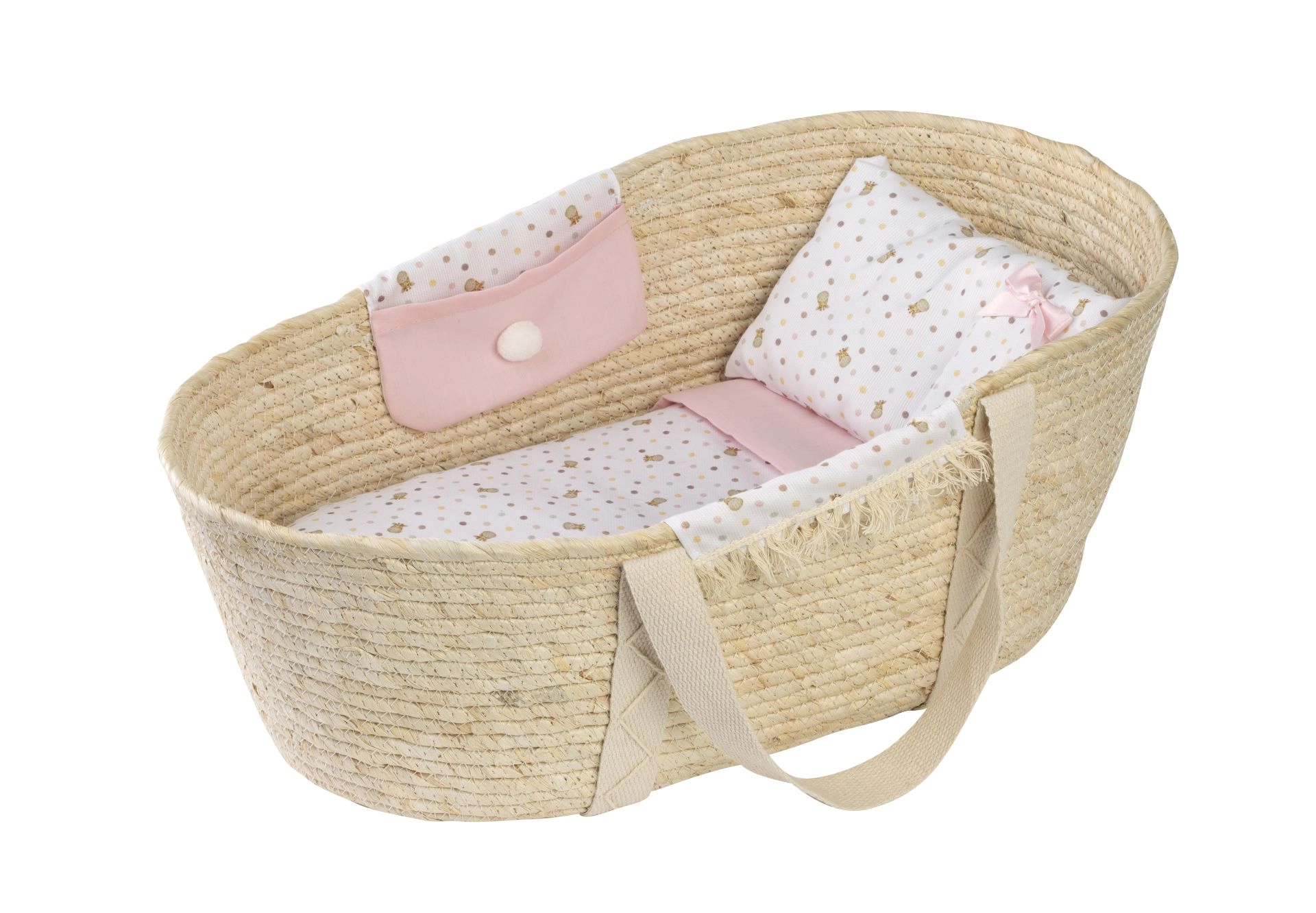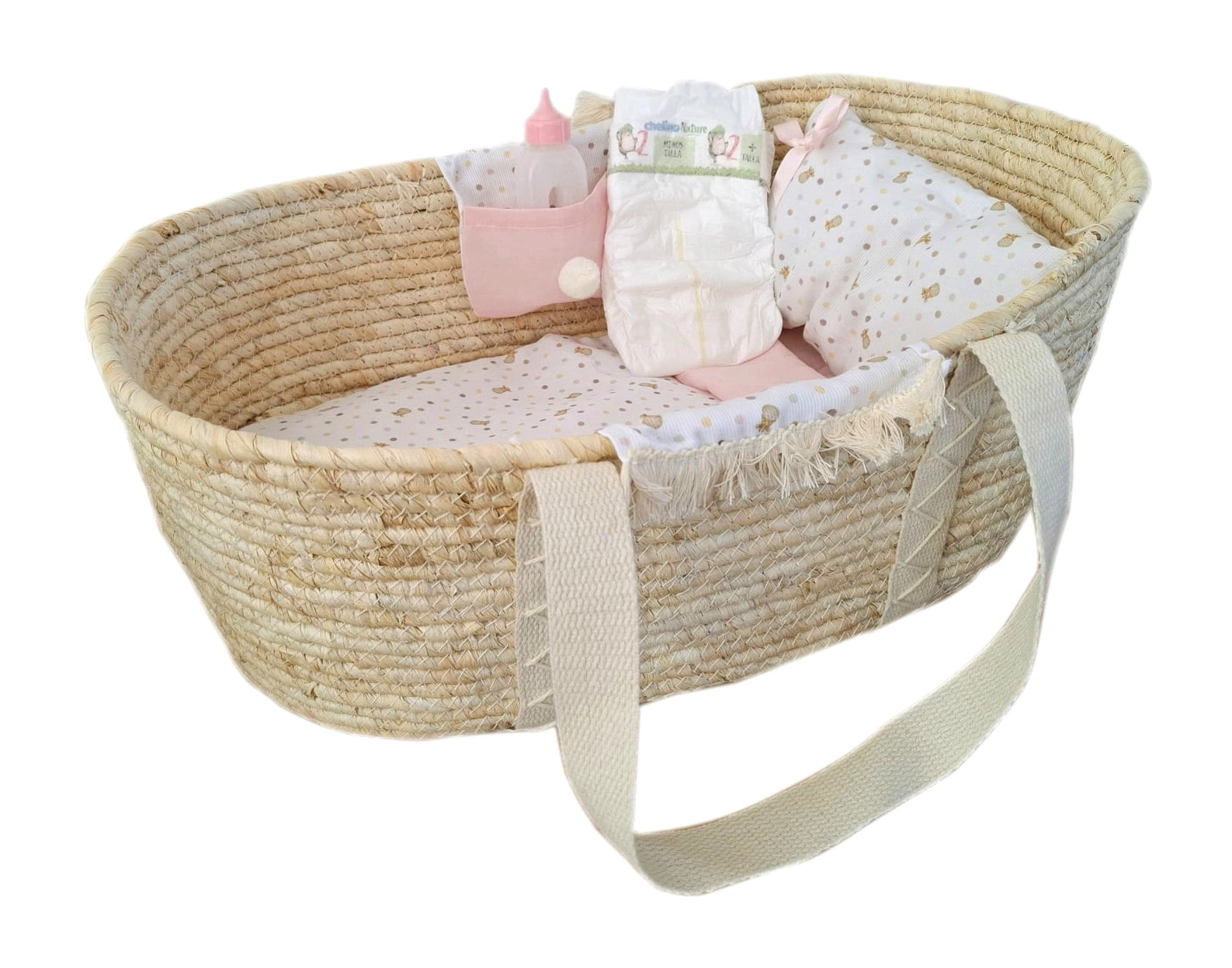 Αυτό το όμορφο καλαθάκι του Μωυσή διαθέτει υφασμάτινες τσεπούλες και στις δύο πλευρές και περιλαμβάνει διακοσμητικό παπλωματάκι, μαξιλάρι και στρώμα. Είναι κατάλληλο για κούκλες μεγέθους 40-45 εκ., αλλά εξυπηρετεί εξαιρετικά και ως χώρος αποθήκευσης για άλλα παιχνίδια, όπως λούτρινα.