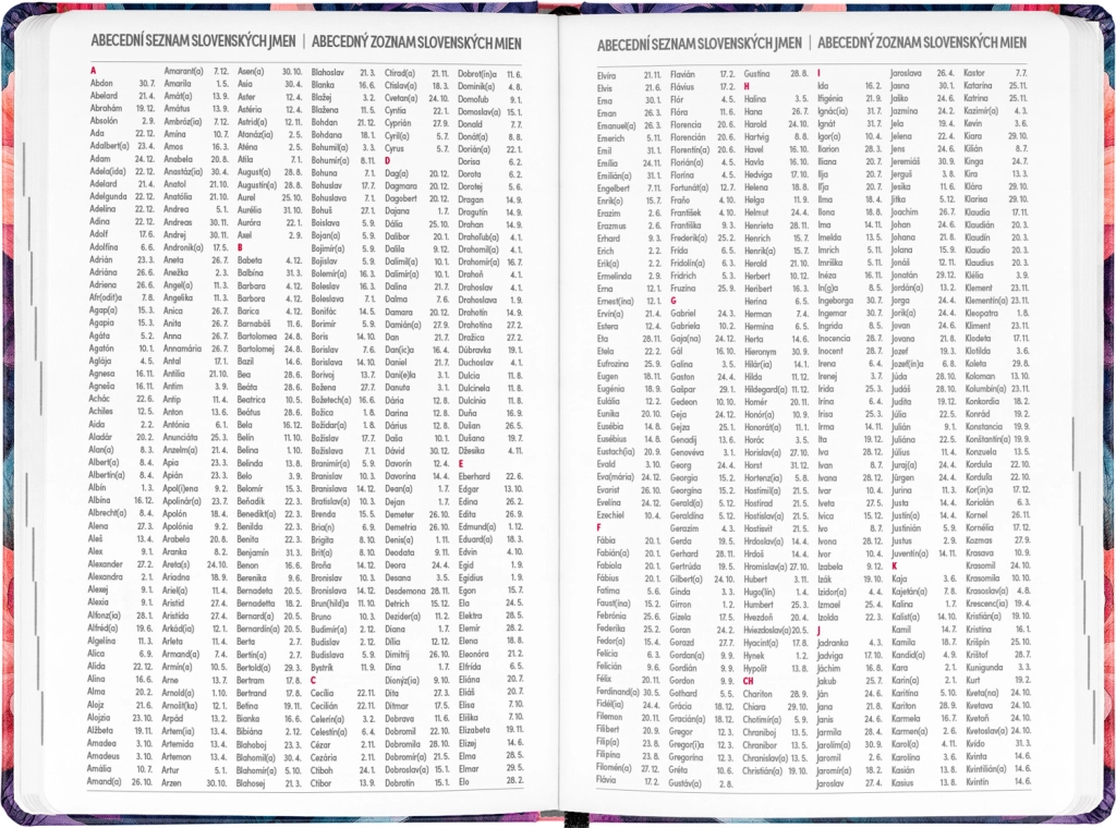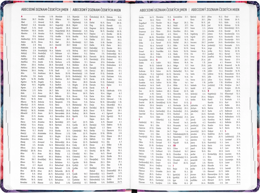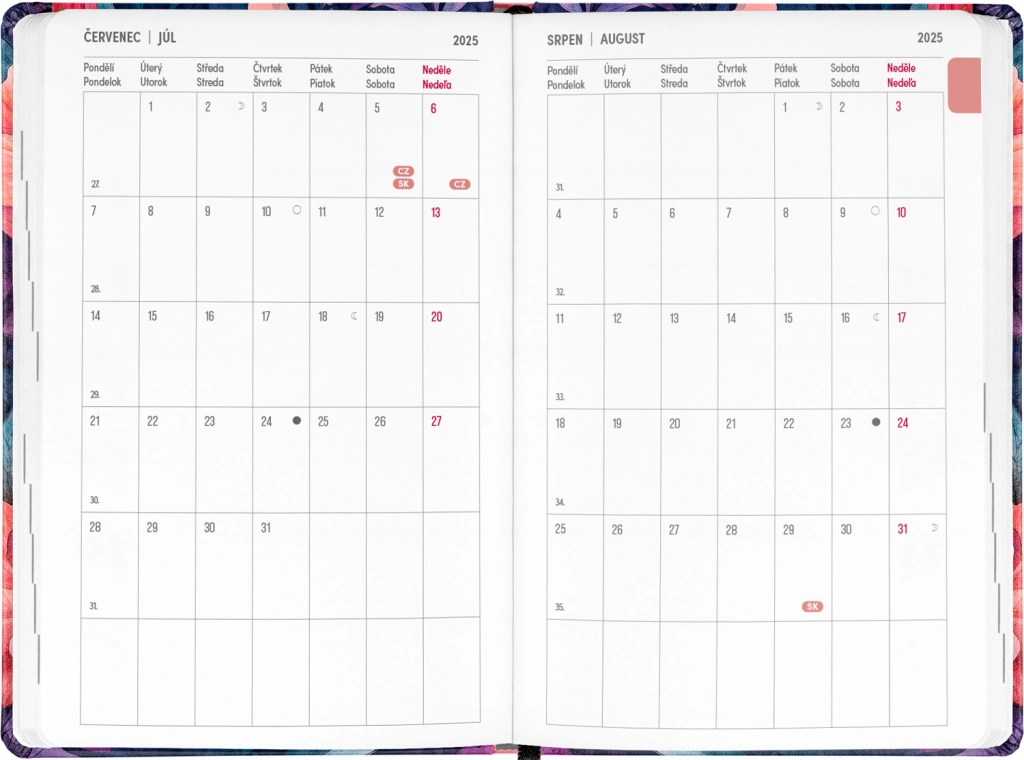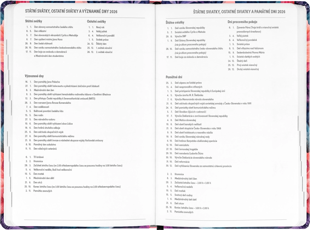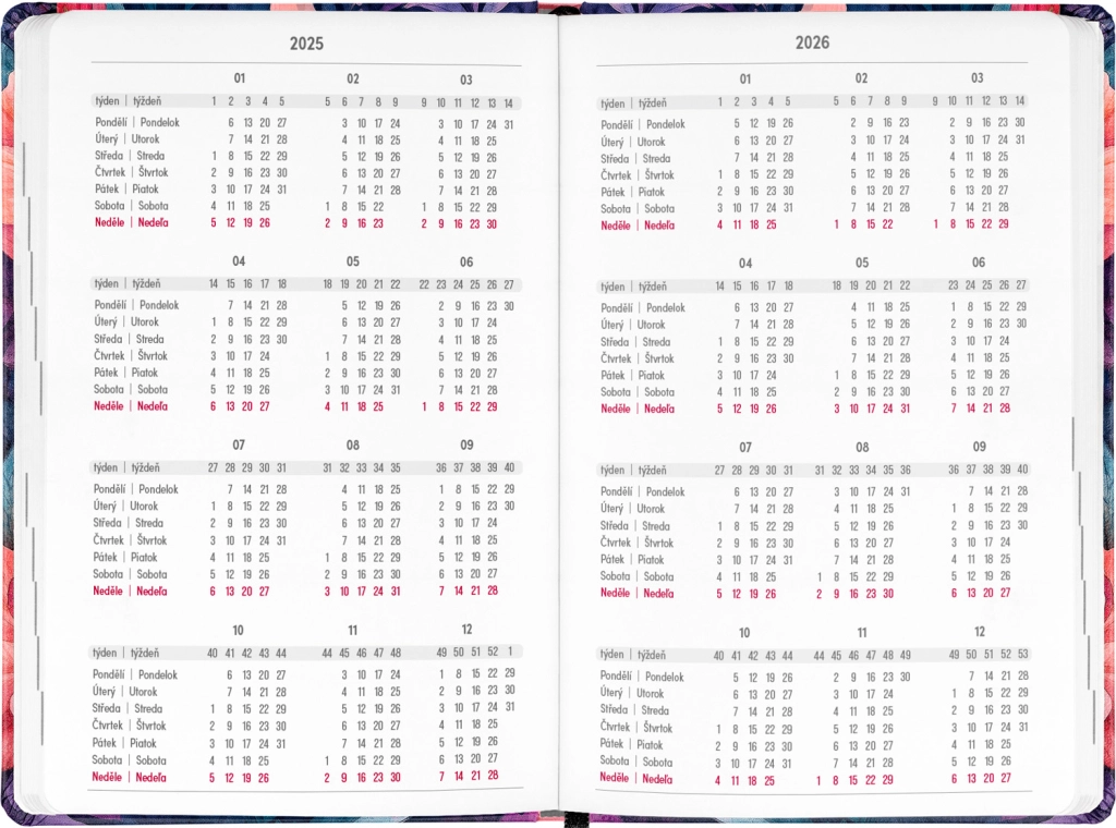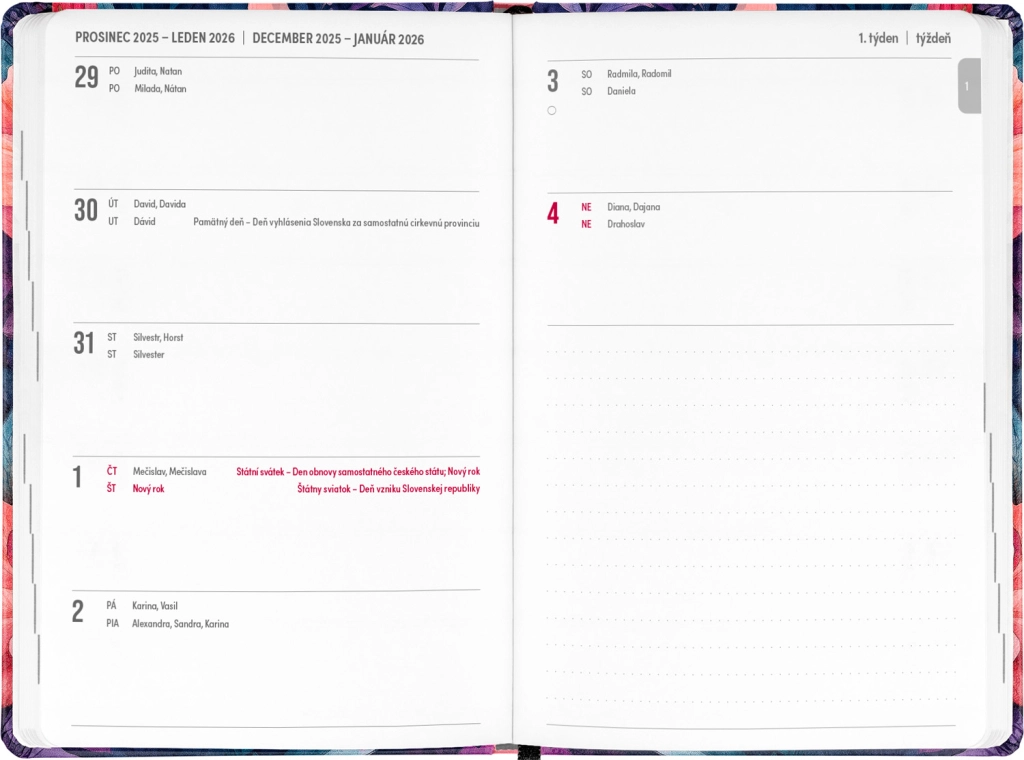 - Τσεχo-σλοβακικό εβδομαδιαίο ημερολόγιο σε γραμμές, το οποίο περιλαμβάνει ονόματα και αργίες.