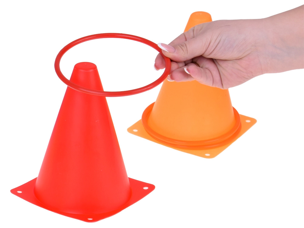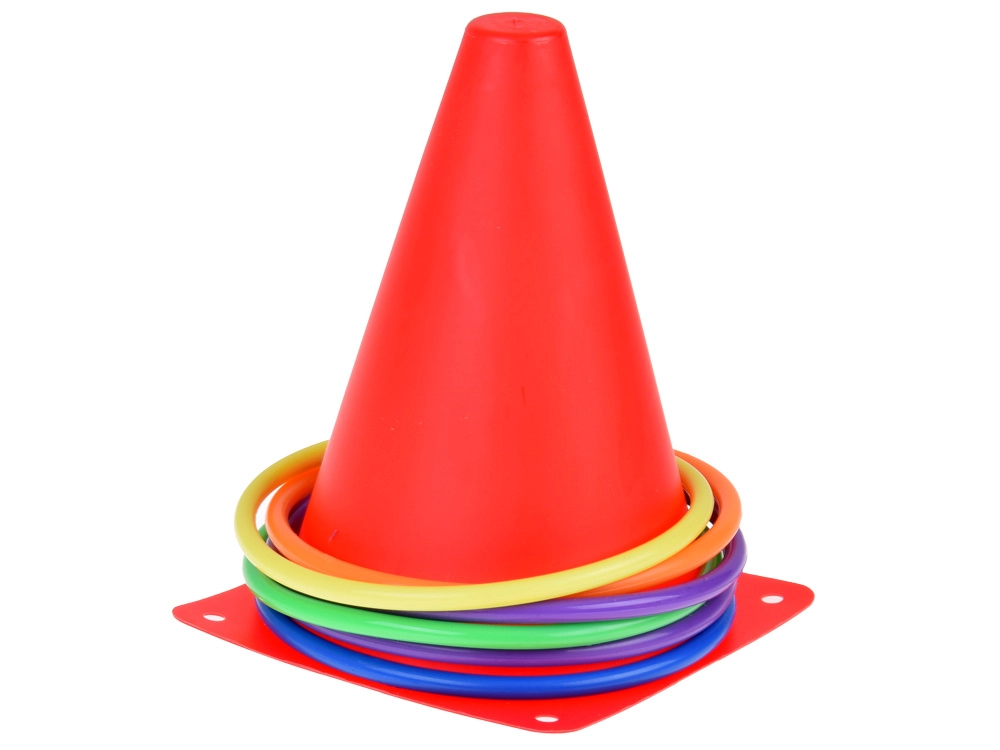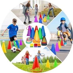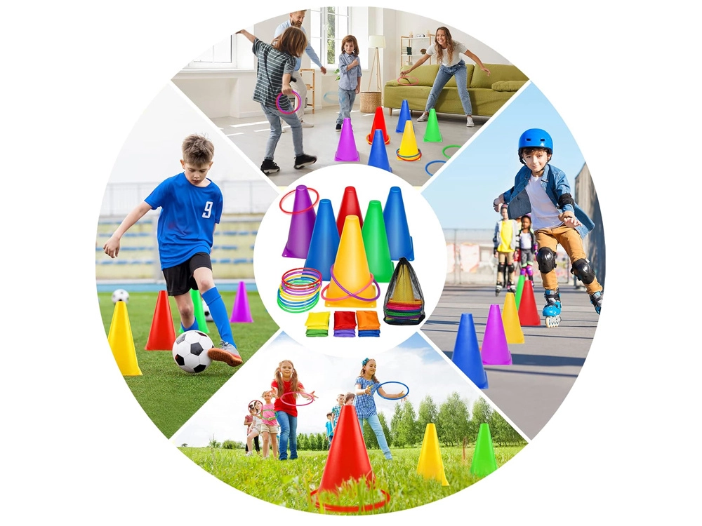 Το σετ περιλαμβάνει κώνους και στεφάνια σε ζωηρά χρώματα που τραβούν την προσοχή και εξασφαλίζουν διασκέδαση στο παιχνίδι. Είναι ιδανικά για τη σήμανση γηπέδων ή σταθμών.