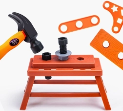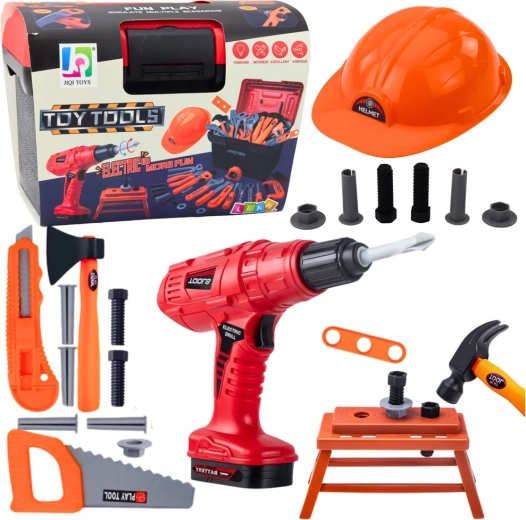 Το παιδικό σετ εργαλείων επιτρέπει στους μικρούς μαστόρους να παίζουν με ασφάλεια με εργαλεία που μοιάζουν αληθινά. Το ηλεκτρικό τρυπάνι με μπαταρίες έχει εναλλάξιμες μύτες – ίσια, σταυροκατσάβιδο και τρυπανόβιδα. Επιπλέον, το σετ περιλαμβάνει πάγκο εργασίας και προστατευτικό κράνος για ακόμα μεγαλύτερο ρεαλισμό στο παιχνίδι.