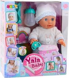 Η κούκλα φοράει πολύχρωμη μπλούζα με κουνελάκι, άνετο παντελόνι και χαριτωμένο σκουφάκι. Κρατάει πιπίλα και στη συσκευασία θα βρείτε επίσης τα απαραίτητα αξεσουάρ για τάισμα και φροντίδα, όπως μπιμπερό, γιογιό και πάνα.