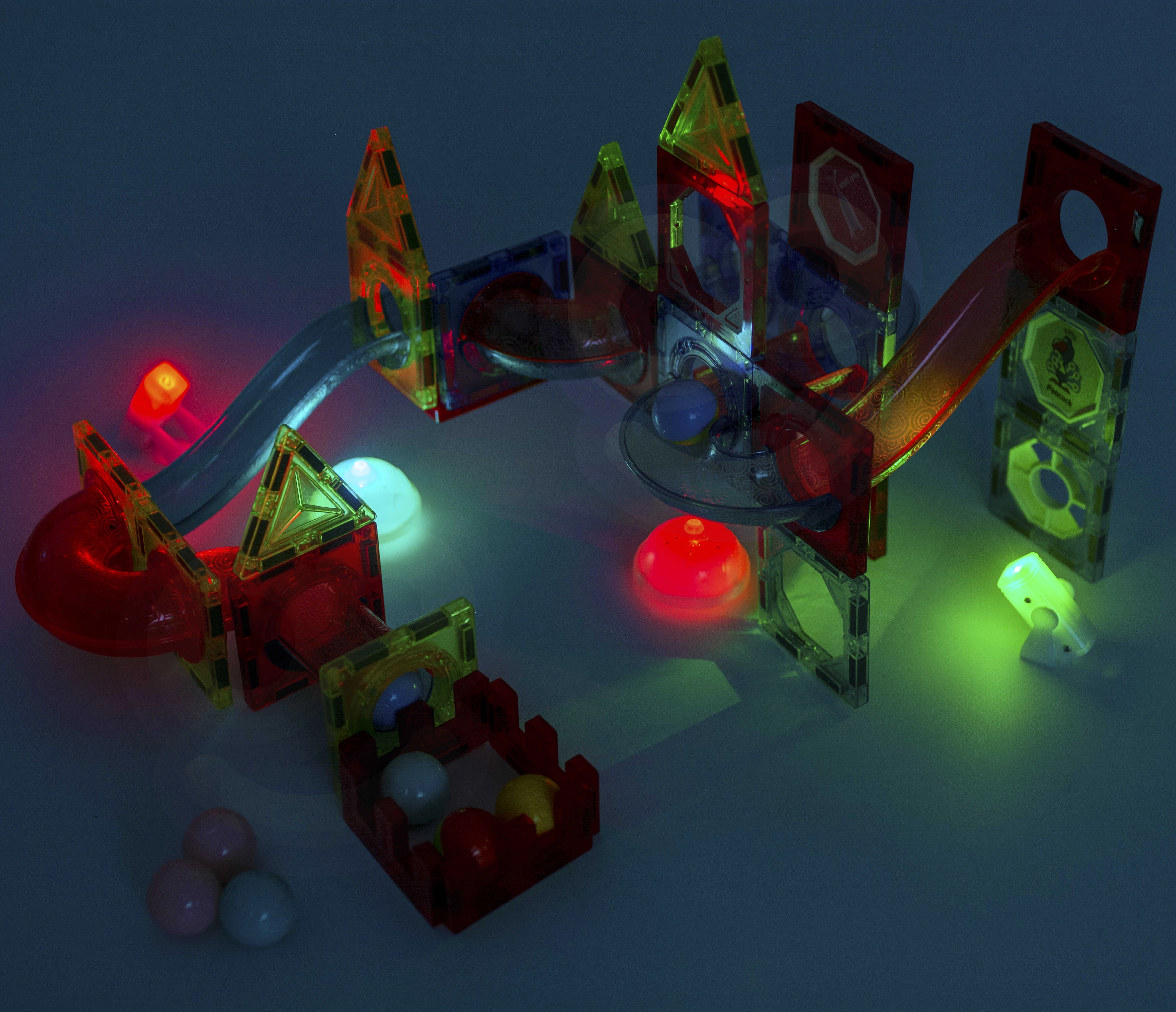 Χρωματιστές φωτεινές μπίλιες και προβολείς φωτίζουν τη διαδρομή και μετατρέπουν κάθε κατασκευή σε εντυπωσιακό θέαμα. Ιδανικό για παιχνίδι στο ημίφως και για να αυξήσει το κίνητρο των παιδιών να δημιουργούν.