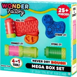 Το σετ Wonder Factory Never Dry Dough Mega Box περιλαμβάνει την ειδική μας πλαστελίνη που δεν ξεραίνεται ποτέ, είναι φιλική προς το περιβάλλον και μυρίζει υπέροχα. Προσφέρει επίσης πολυεργαλείο 4 σε 1, με το οποίο μπορείτε να: