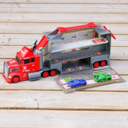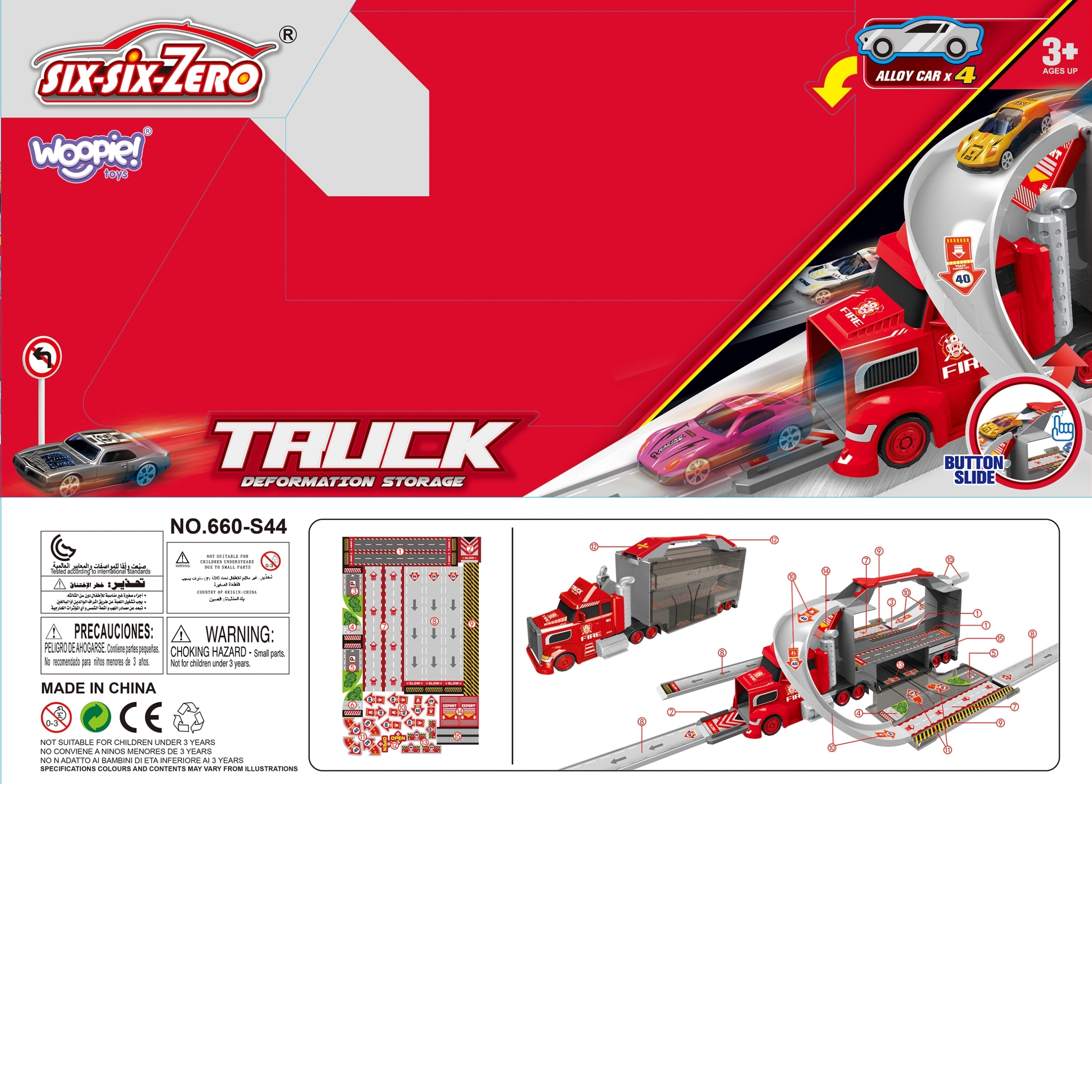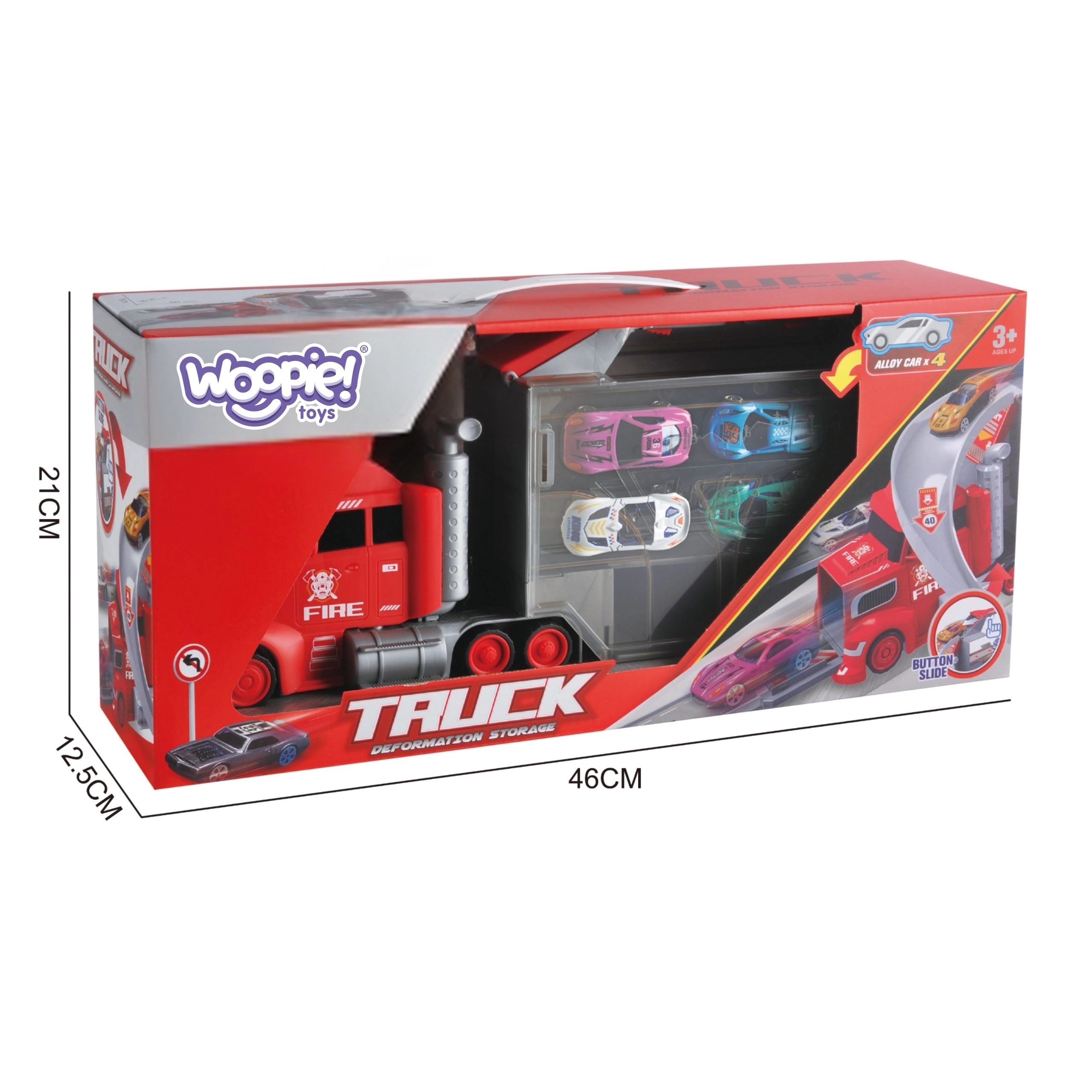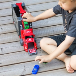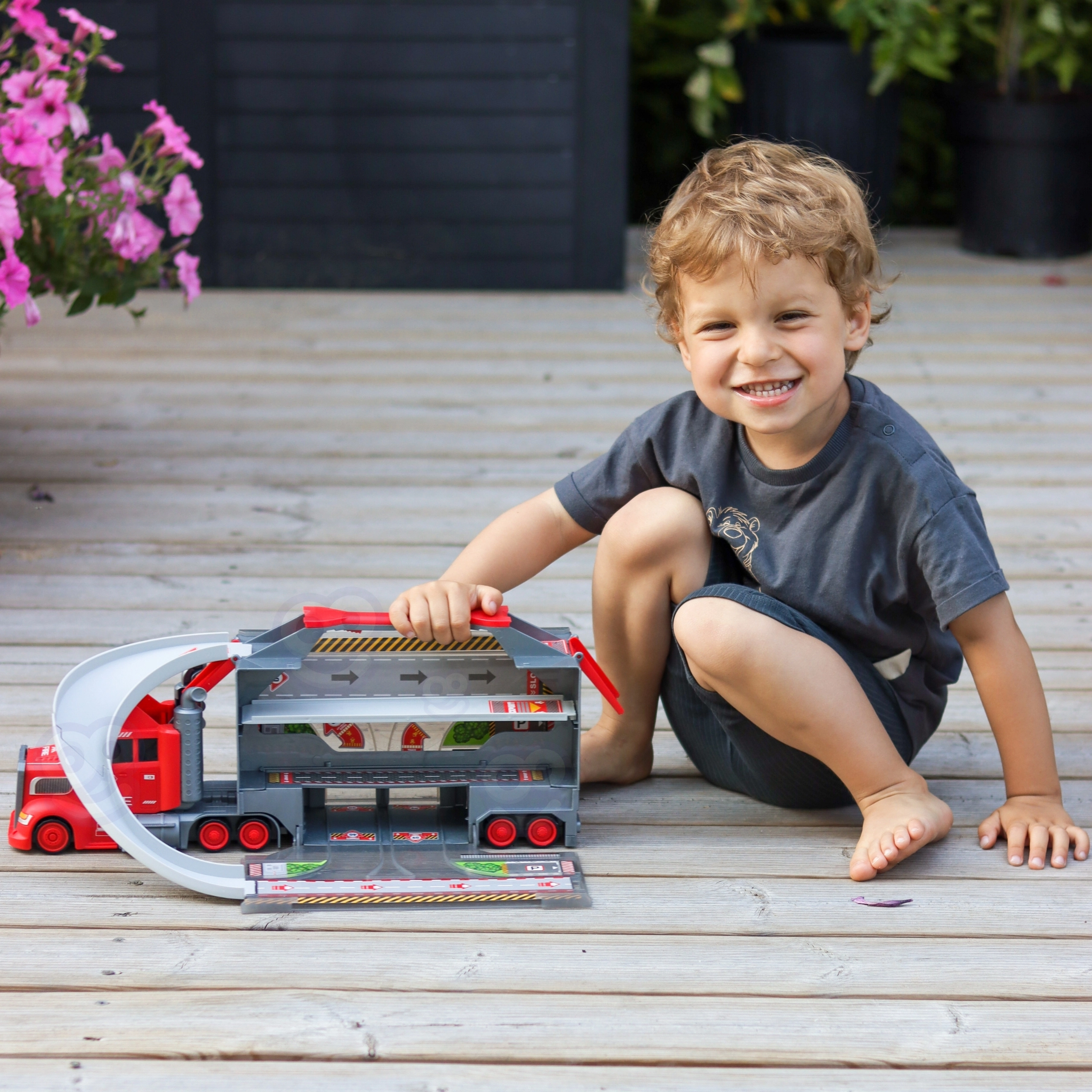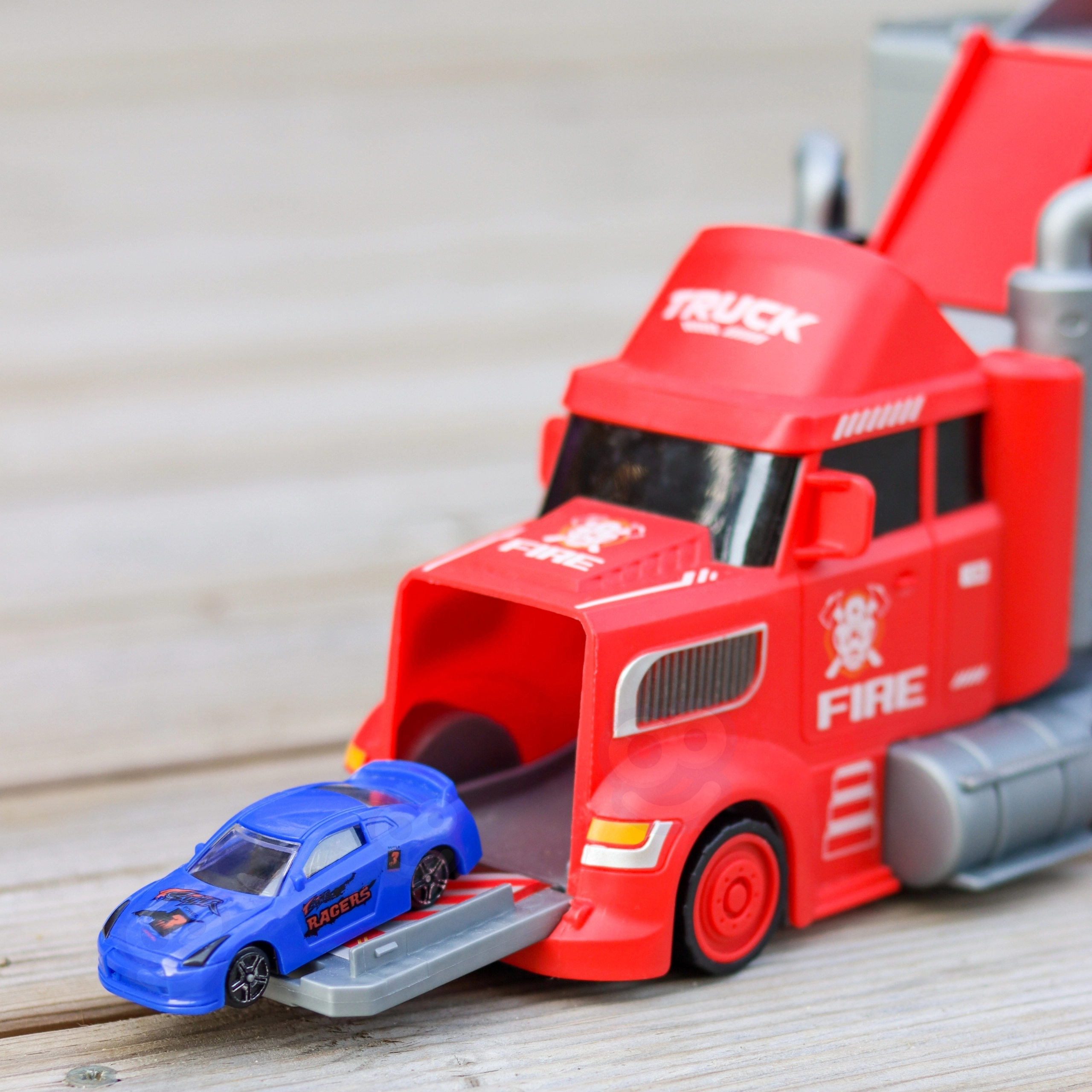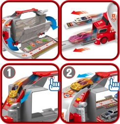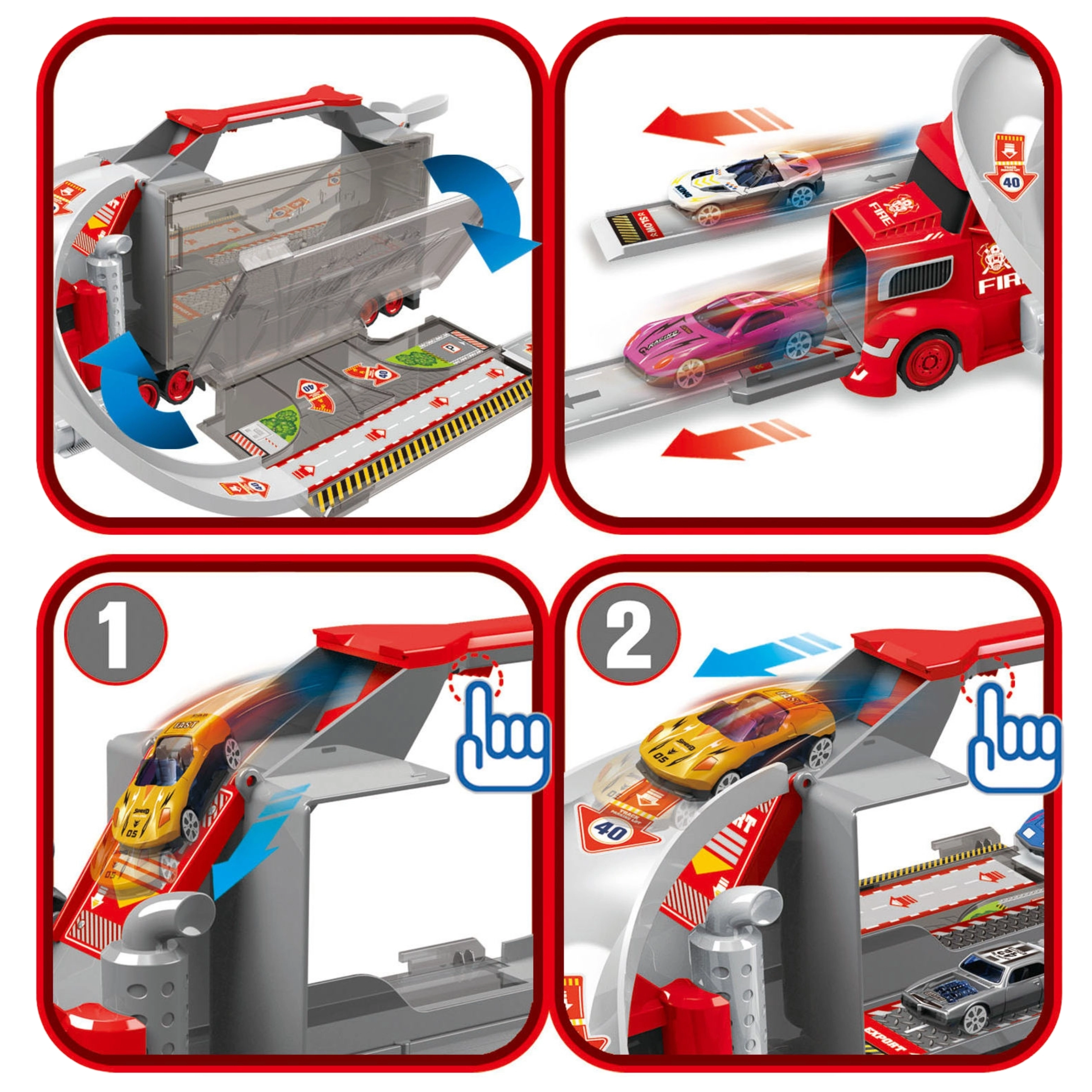 Αυτό το πολυλειτουργικό φορτηγό με ελκυστικό πυροσβεστικό σχεδιασμό λειτουργεί ως ρυμουλκό μεταφοράς και, όταν ανοίγει, μετατρέπεται σε ένα πλήρες σετ παιχνιδιού με γκαράζ, θέσεις στάθμευσης και δυναμική πίστα. Χάρη στον εκτοξευτή αυτοκινήτων, τα παιδιά ξεκινούν τους αγώνες σε δευτερόλεπτα.