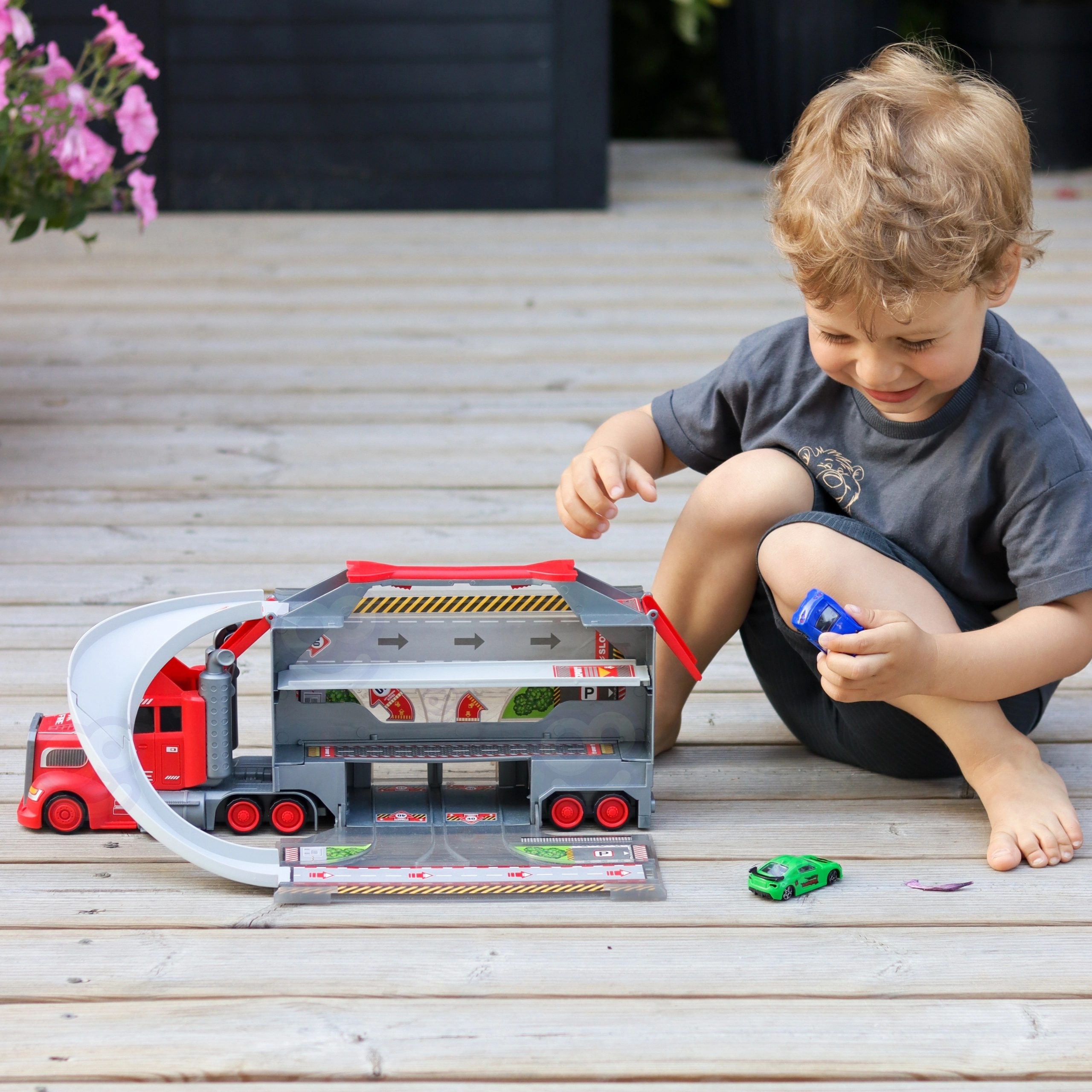 Το φορτηγό λειτουργεί ως πλατφόρμα μεταφοράς – φορτώστε τα αυτοκινητάκια, αποθηκεύστε τα με ασφάλεια και ξεκινήστε μια νέα περιπέτεια.