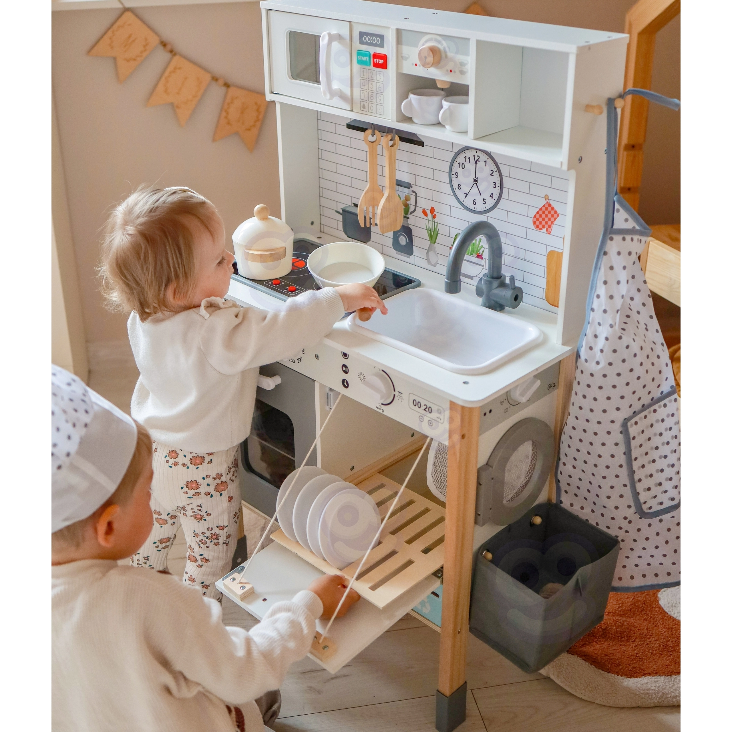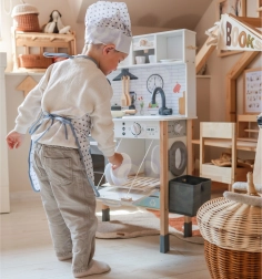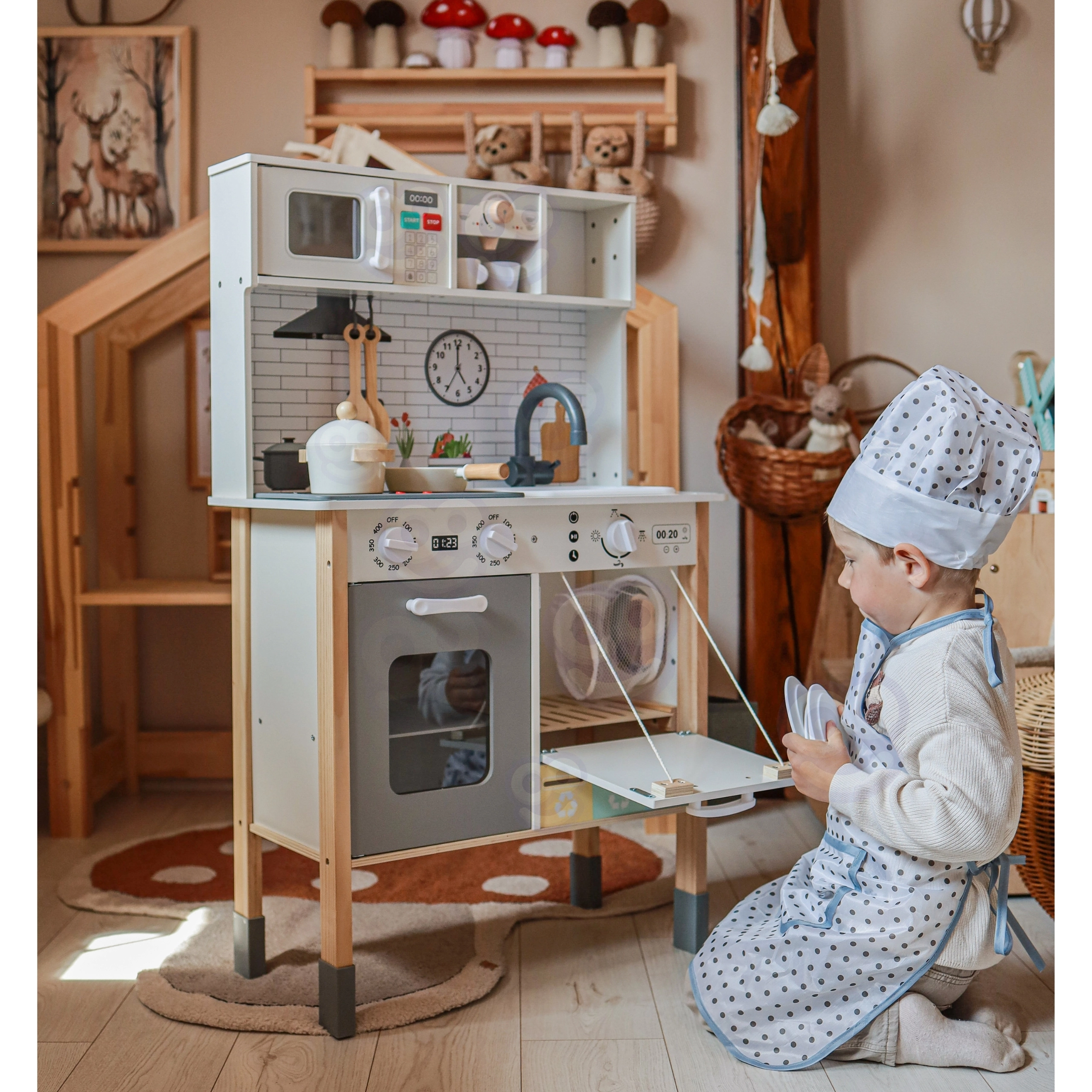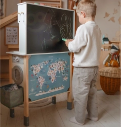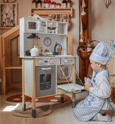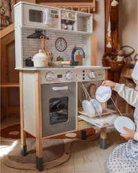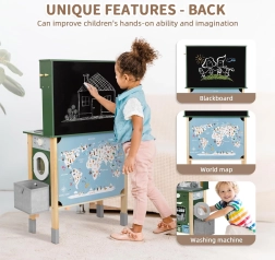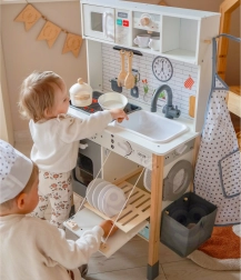 Αυτή η ξύλινη κουζίνα WOOPIE GREEN έχει σχεδιαστεί για μικρούς σεφ και εξερευνητές. Η μπροστινή πλευρά προσφέρει άρτια εξοπλισμένη ζώνη μαγειρικής με καφετιέρα, φούρνο μικροκυμάτων, νεροχύτη, φούρνο, πλυντήριο πιάτων και επαγωγική εστία με φώτα και ήχους. Στο πλάι υπάρχει πρακτικό πλυντήριο ρούχων με καλάθι, που διδάσκει παιχνίδι-παιχνίδι τις παιδικές ρουτίνες. Η πίσω πλευρά κρύβει πίνακα κιμωλίας και έγχρωμο χάρτη του κόσμου για ζωγραφική, γνωριμία με τις ηπείρους και ανάπτυξη της φαντασίας.