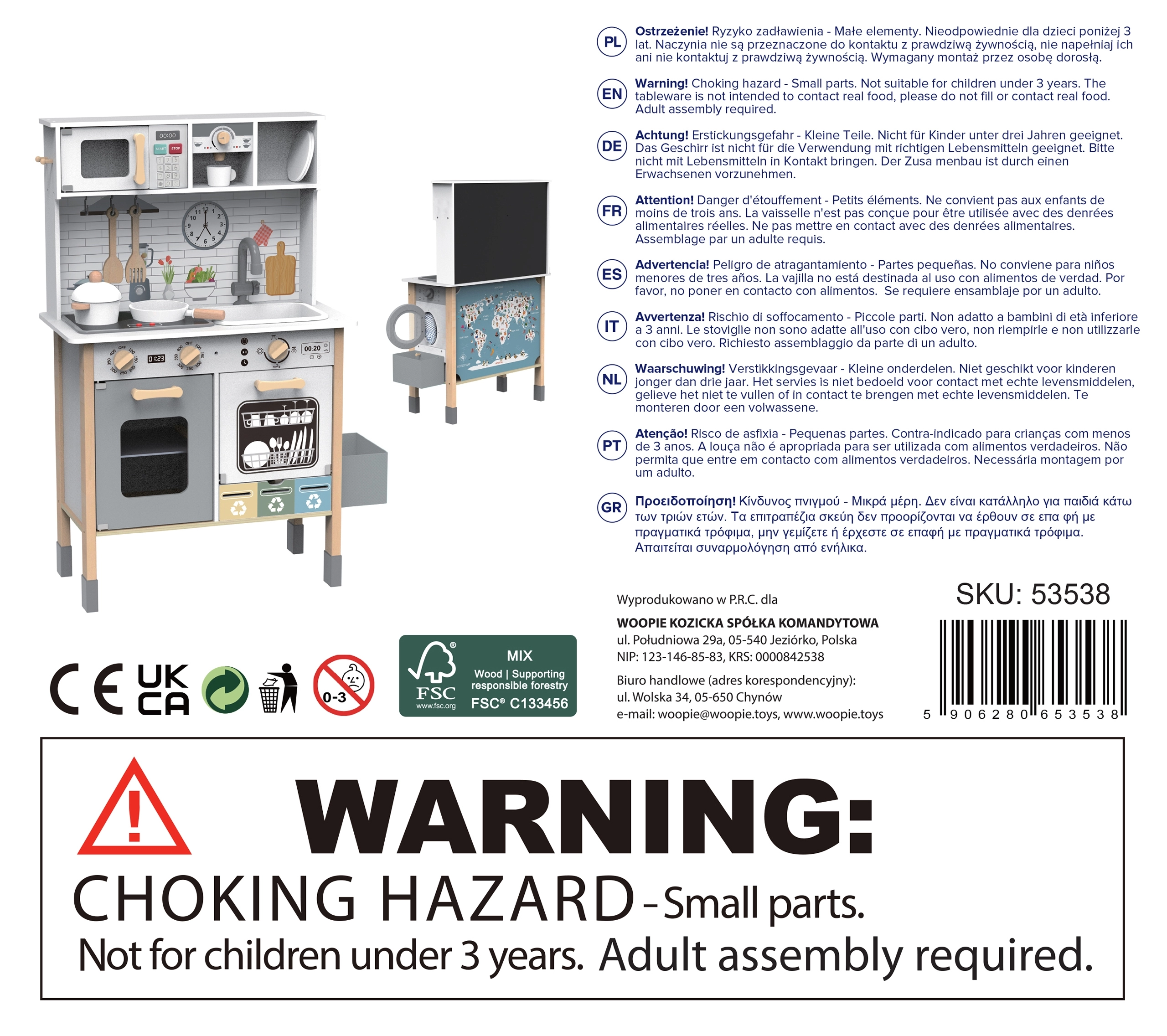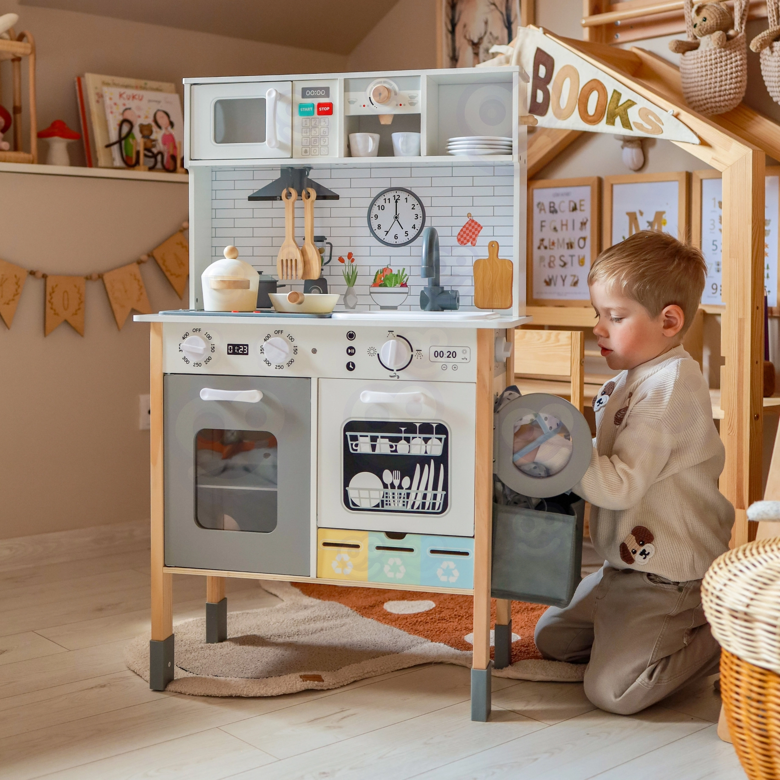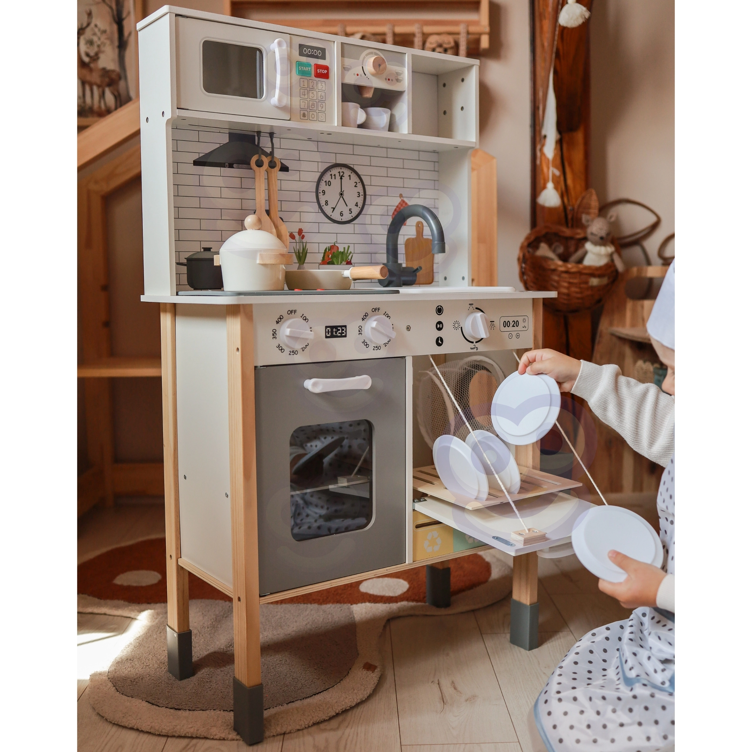 Αυτή η ξύλινη κουζίνα WOOPIE GREEN έχει σχεδιαστεί για μικρούς σεφ και εξερευνητές. Η μπροστινή πλευρά προσφέρει άρτια εξοπλισμένη ζώνη μαγειρικής με καφετιέρα, φούρνο μικροκυμάτων, νεροχύτη, φούρνο, πλυντήριο πιάτων και επαγωγική εστία με φώτα και ήχους. Στο πλάι υπάρχει πρακτικό πλυντήριο ρούχων με καλάθι, που διδάσκει παιχνίδι-παιχνίδι τις παιδικές ρουτίνες. Η πίσω πλευρά κρύβει πίνακα κιμωλίας και έγχρωμο χάρτη του κόσμου για ζωγραφική, γνωριμία με τις ηπείρους και ανάπτυξη της φαντασίας.