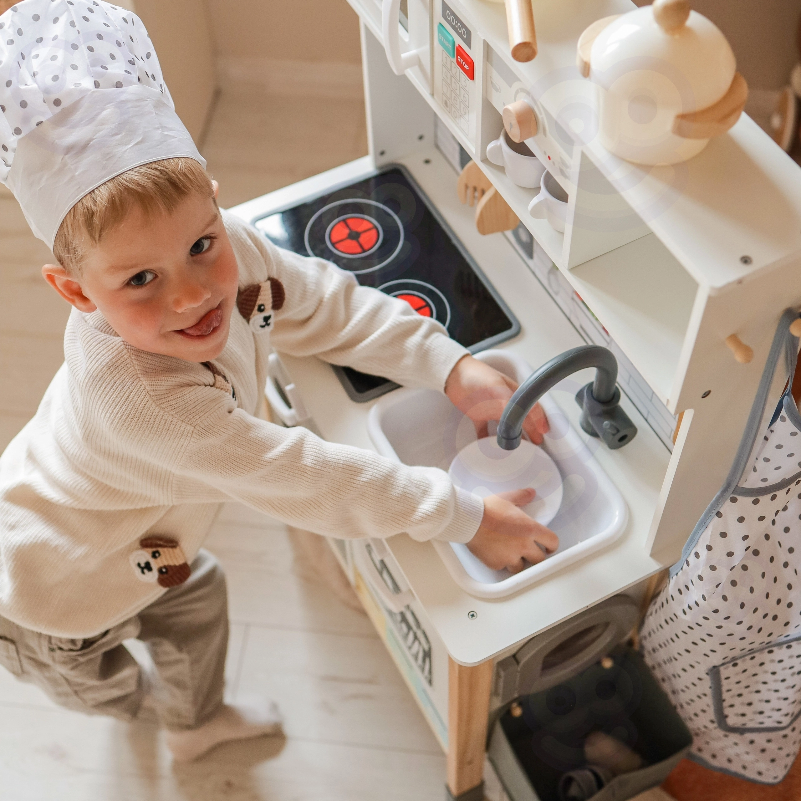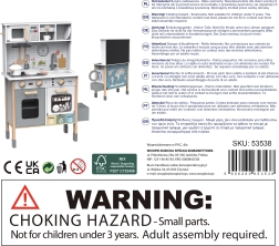 Περιλαμβάνεται πλούσιος εξοπλισμός: σερβίτσια, εργαλεία μαγειρικής, πινακάκι για διαλογή απορριμμάτων σε συρταρωτούς κάδους καθώς και σετ σεφ (ποδιά και σκούφος). Το ύψος της κουζίνας ρυθμίζεται για άνετη χρήση. Οι μπαταρίες δεν περιλαμβάνονται.