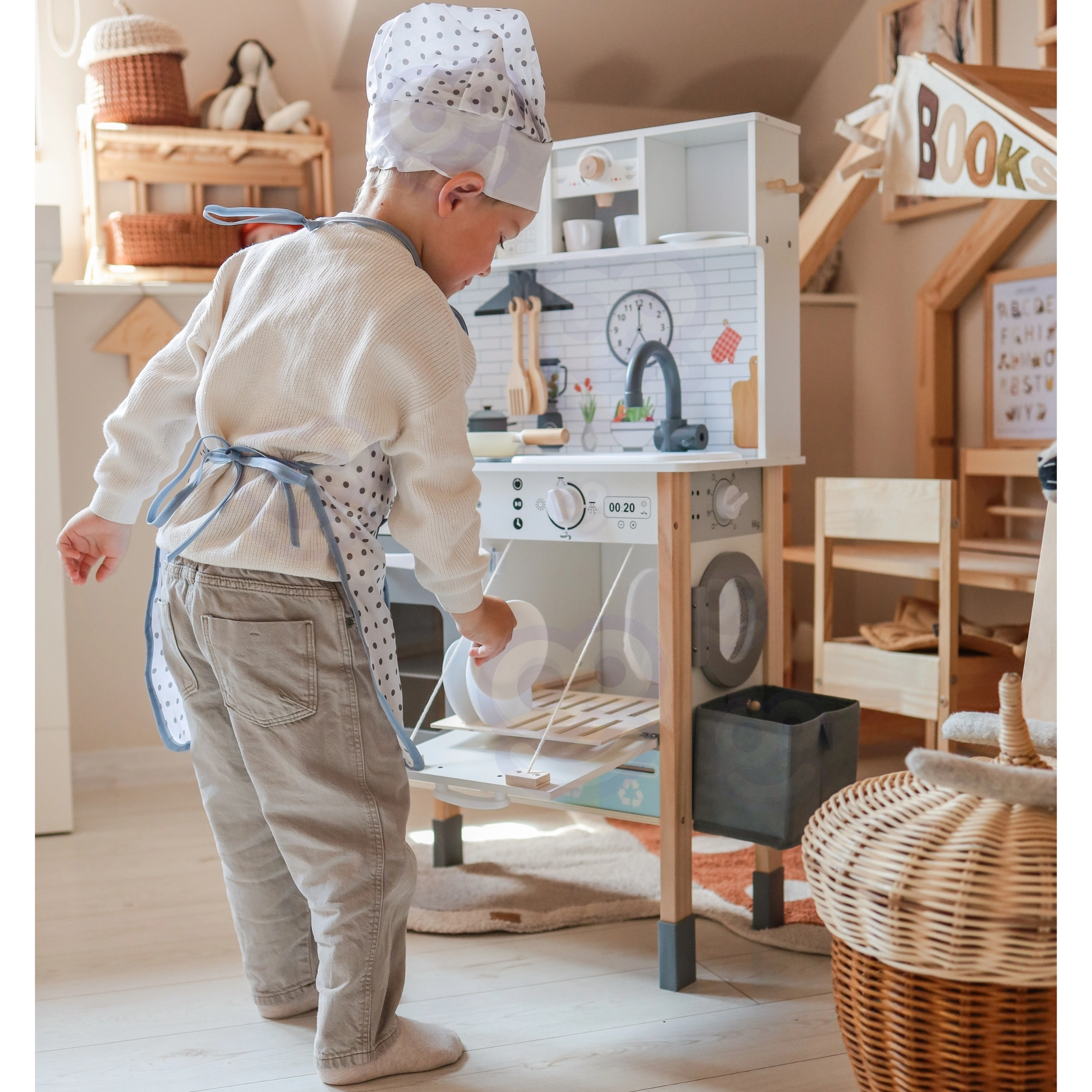 - Κουζίνα με φούρνο μικροκυμάτων, φούρνο, πλυντήριο πιάτων, πλυντήριο ρούχων και καφετιέρα· καλάθι για άπλυτα· 4 πιάτα· κούπα· κατσαρόλα· τηγάνι· σπάτουλα· πιρούνι· ποδιά και σκούφος σεφ· πίνακας κιμωλίας· χάρτης του κόσμου· καρτέλες με εικόνες απορριμμάτων για διαλογή