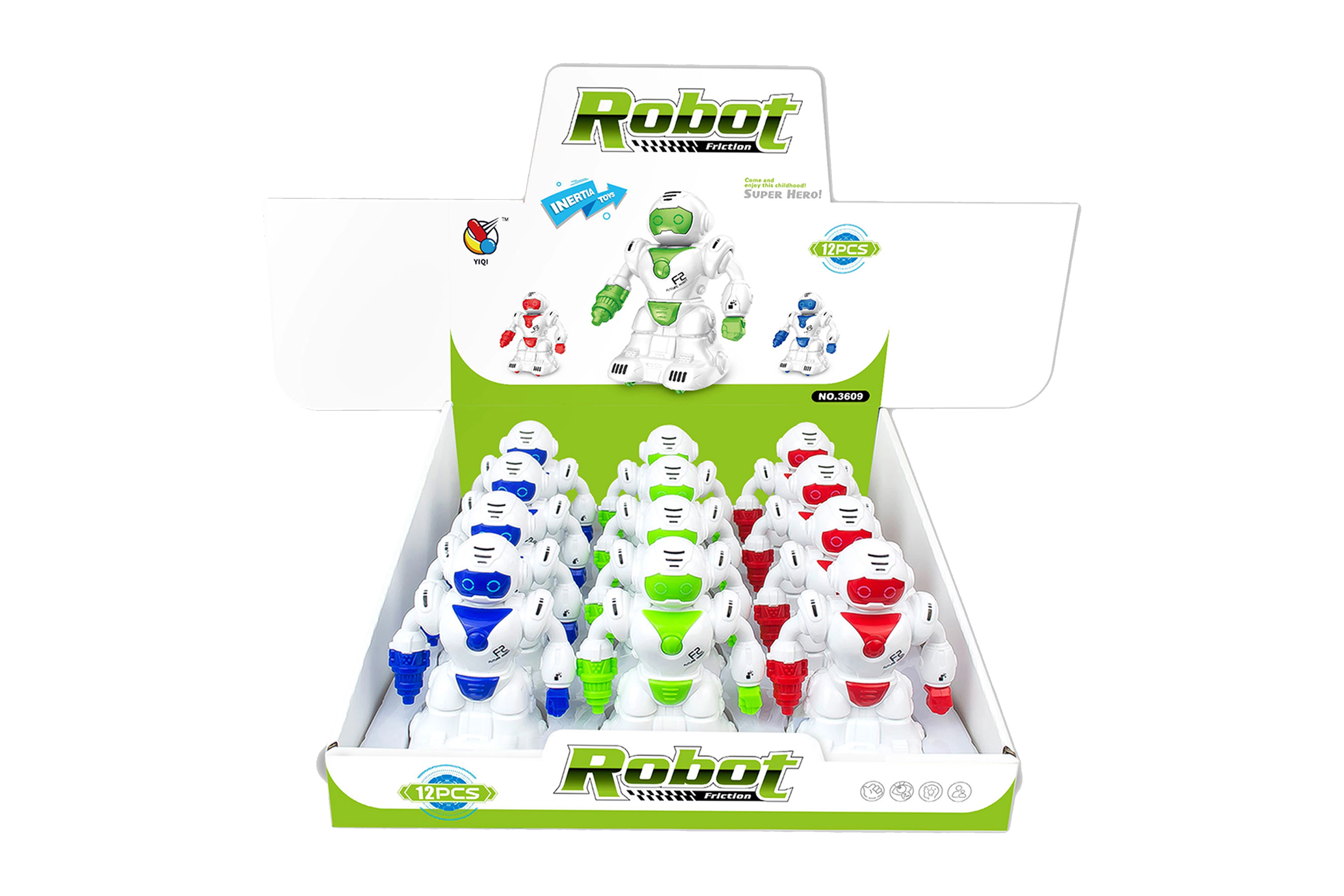Ανακαλύψτε τη διασκέδαση με το ρομπότ αδράνειας διαστάσεων 12 cm, διαθέσιμο σε τρία ζωηρά χρώματα: πράσινο, μπλε και κόκκινο.
