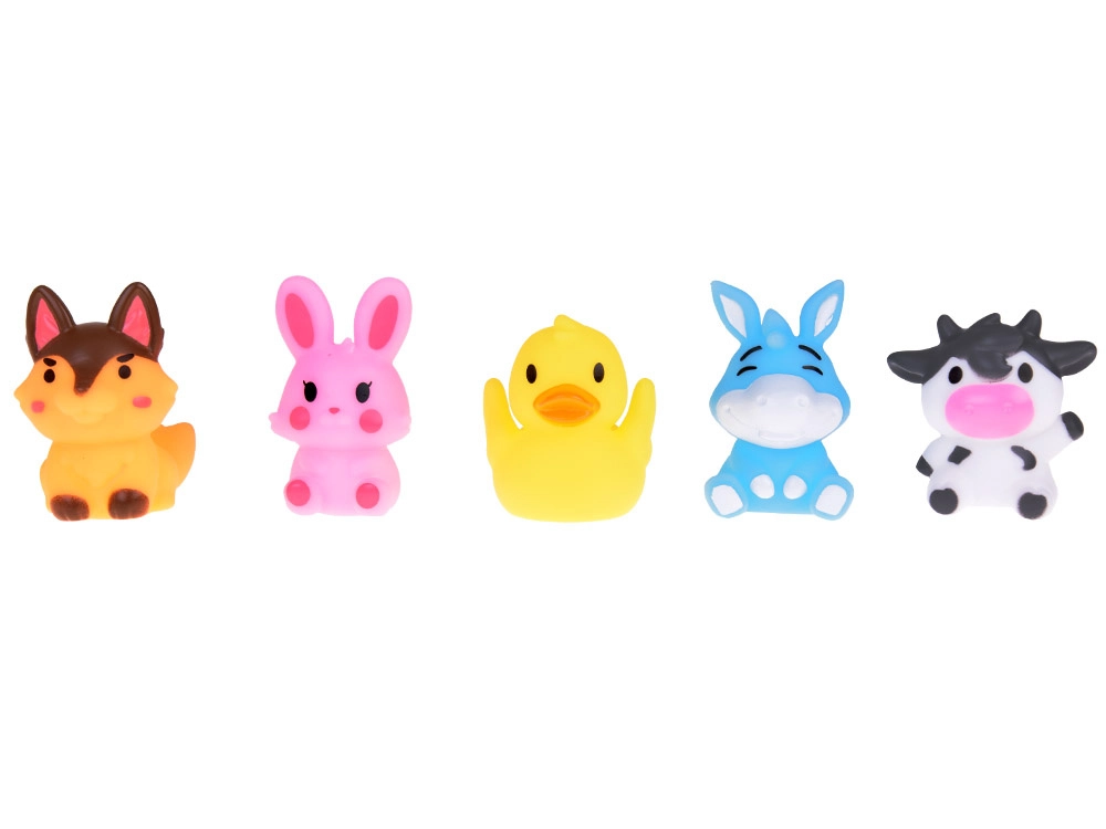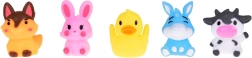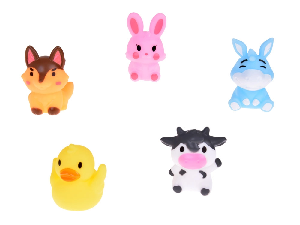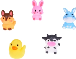 Το σετ περιλαμβάνει: 5 λαστιχένιες φιγούρες ζώων φάρμας, καθεμία σε διαφορετικό χρώμα (κουνέλι, αγελάδα, σκύλος, πάπια, γάιδαρος) με διαστάσεις περίπου 5 cm x 4 cm x 4 cm. Το παιχνίδι είναι κατασκευασμένο από ασφαλή, λαστιχένια υλικά, φιλικά προς την ευαίσθητη παιδική επιδερμίδα. Εύκολο στη συντήρηση και πολύ ανθεκτικό, ώστε να διαρκεί για μεγάλο χρονικό διάστημα.