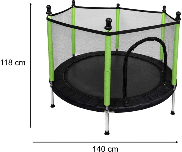 Προσφέρετε στα παιδιά υγιή άσκηση και ατελείωτη διασκέδαση με το συμπαγές παιδικό τραμπολίνο διαμέτρου 140 cm. Χάρη στο προστατευτικό δίχτυ με διπλό φερμουάρ, τη σταθερή μεταλλική κατασκευή και τα αντιολισθητικά ποδαράκια, το πήδημα είναι ασφαλές τόσο στο σπίτι όσο και σε εξωτερικό χώρο. 36 ελατήρια και η ελαστική επιφάνεια αναπήδησης εξασφαλίζουν εξαιρετική ώθηση, ενώ το σετ με 10 πολύχρωμες μπαλίτσες μετατρέπει κάθε παιχνίδι σε ακόμη πιο διασκεδαστική εμπειρία.