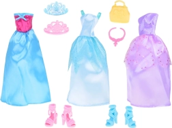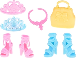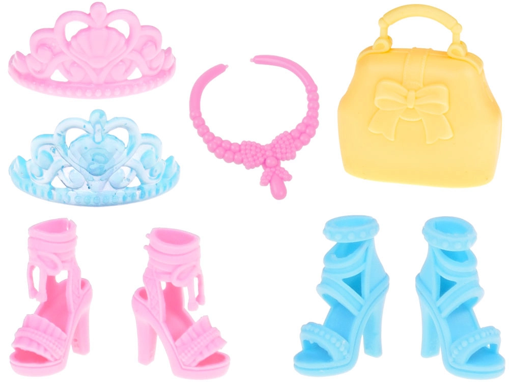 Δύο κομψά ζευγάρια ψηλοτάκουνα παπούτσια προσθέτουν γοητεία και στυλ στη συνολική εμφάνιση. Τα αξεσουάρ, όπως η πρακτική τσάντα, το ροζ κολιέ και δύο κορόνες, είναι ιδανικά για κάθε μικρή πριγκίπισσα.