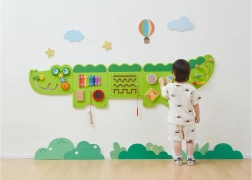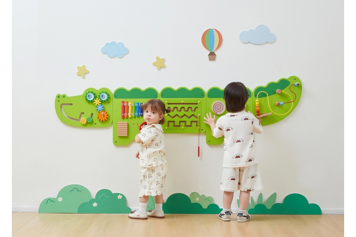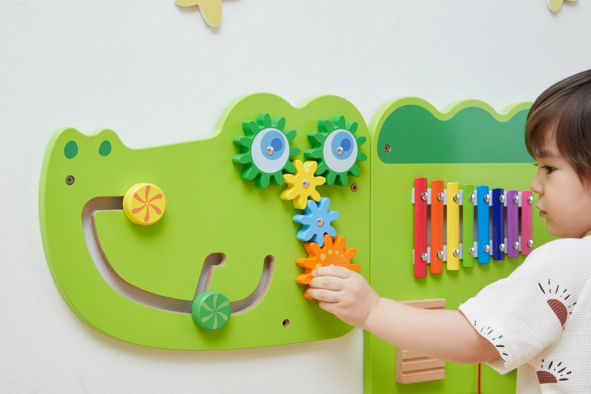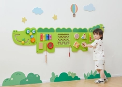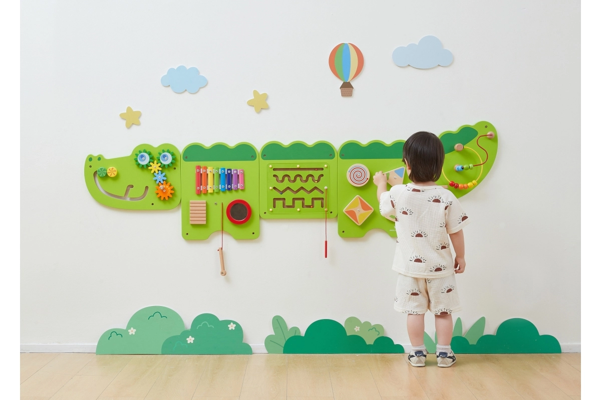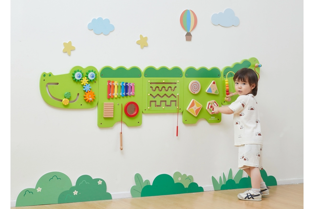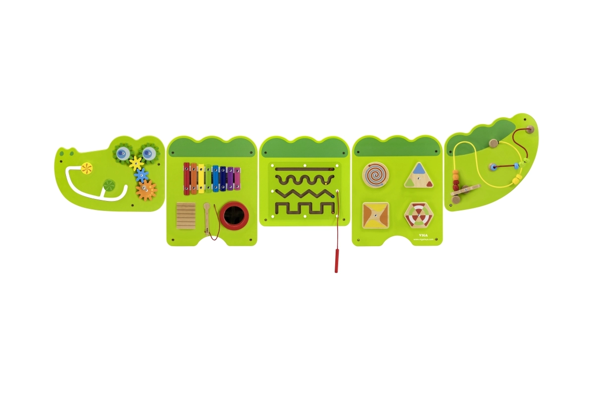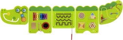Διασκεδαστικός ξύλινος επιτοίχιος πίνακας σε σχήμα κροκόδειλου προσφέρει σε παιδιά από 18 μηνών ώρες αισθητηριακής εξερεύνησης και εξάσκησης λεπτής κινητικότητας. Περιλαμβάνει ξυλόφωνο, οδοντωτούς τροχούς, λαβύρινθο, συρόμενα και περιστρεφόμενα στοιχεία καθώς και χάντρες σε σύρμα, που αναπτύσσουν την οπτικοκινητική συντονιστική ικανότητα, τη λογική σκέψη και την μουσική αντίληψη. Χάρη στην επιτοίχια τοποθέτηση εξοικονομεί χώρο και είναι ιδανικός για παιδικά δωμάτια, νηπιαγωγεία και γωνιές παιχνιδιού.