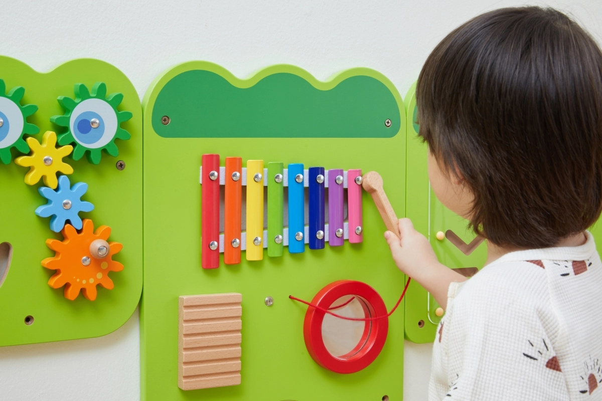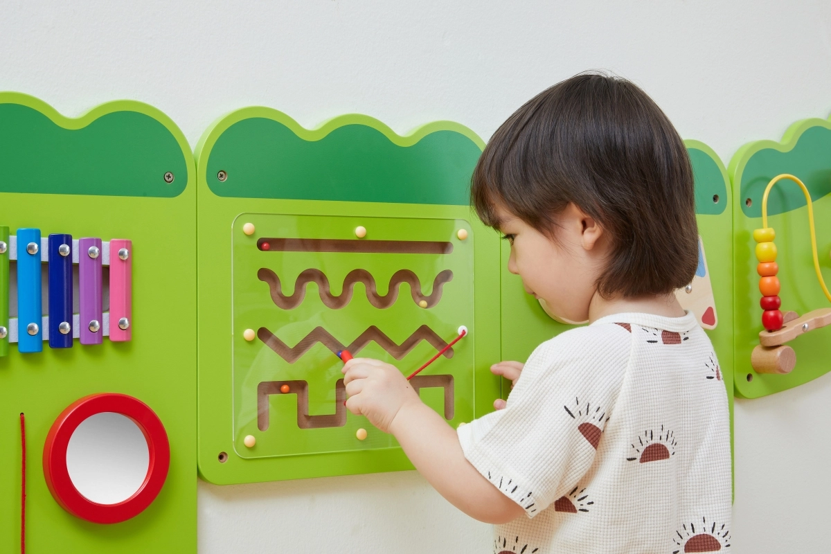 Κάθε πάνελ προσφέρει διαφορετική δραστηριότητα – από το παίξιμο στο ξυλόφωνο, την περιστροφή γραναζιών και δίσκων με μοτίβα, μέχρι την καθοδήγηση χαντρών και τη μετακίνηση κομματιών σε λαβύρινθους. Τα παιδιά εξασκούν φυσικά τον συντονισμό, τη λαβή, την υπομονή και την επίλυση προβλημάτων. Η επιτοίχια τοποθέτηση εξοικονομεί χώρο και επιτρέπει ταυτόχρονο παιχνίδι σε περισσότερα παιδιά.