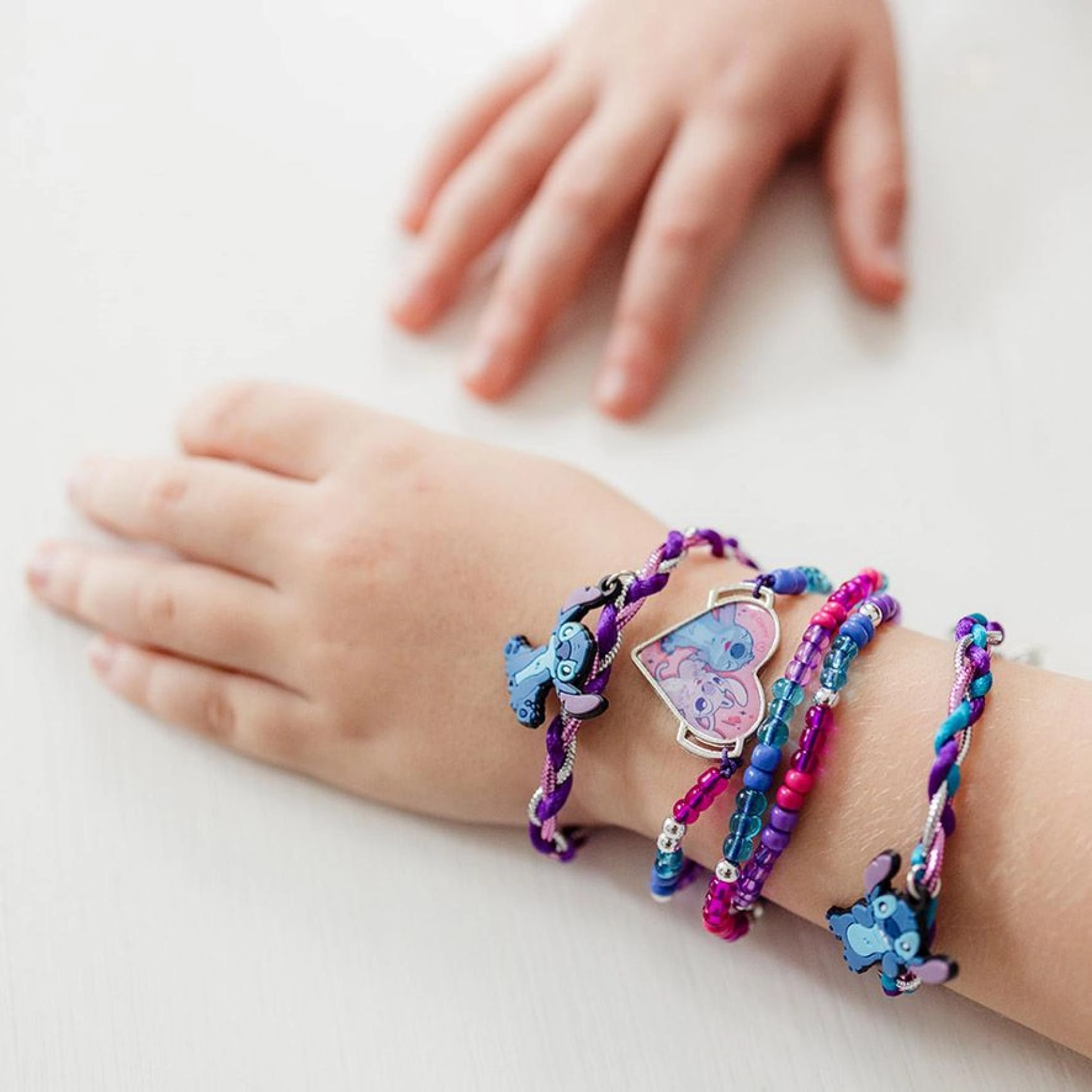 Το σετ περιλαμβάνει χάντρες σε διάφορα χρώματα, κορδόνια, τελειώματα, κρικάκια, κουμπώματα και κρεμαστά STITCH – απλώς ανοίγετε και δημιουργείτε.