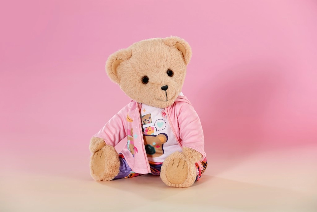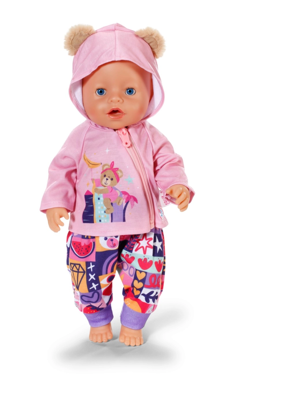 Ένα χαριτωμένο σετ ρούχων για κούκλες μεγέθους 43 cm που ζεσταίνει και χαρίζει χαρά σε κάθε παιχνίδι. Περιλαμβάνει πρακτικό ροζ φούτερ με κουκούλα και αυτάκια, ανοιχτό μωβ μακρυμάνικο μπλουζάκι με σχέδιο αρκουδάκι και πολύχρωμο παντελόνι με patchwork μοτίβο. Ιδανικό για δημιουργικό παιχνίδι φροντίδας και εύκολο ντύσιμο, συμβατό επίσης με BABY born Teddy.